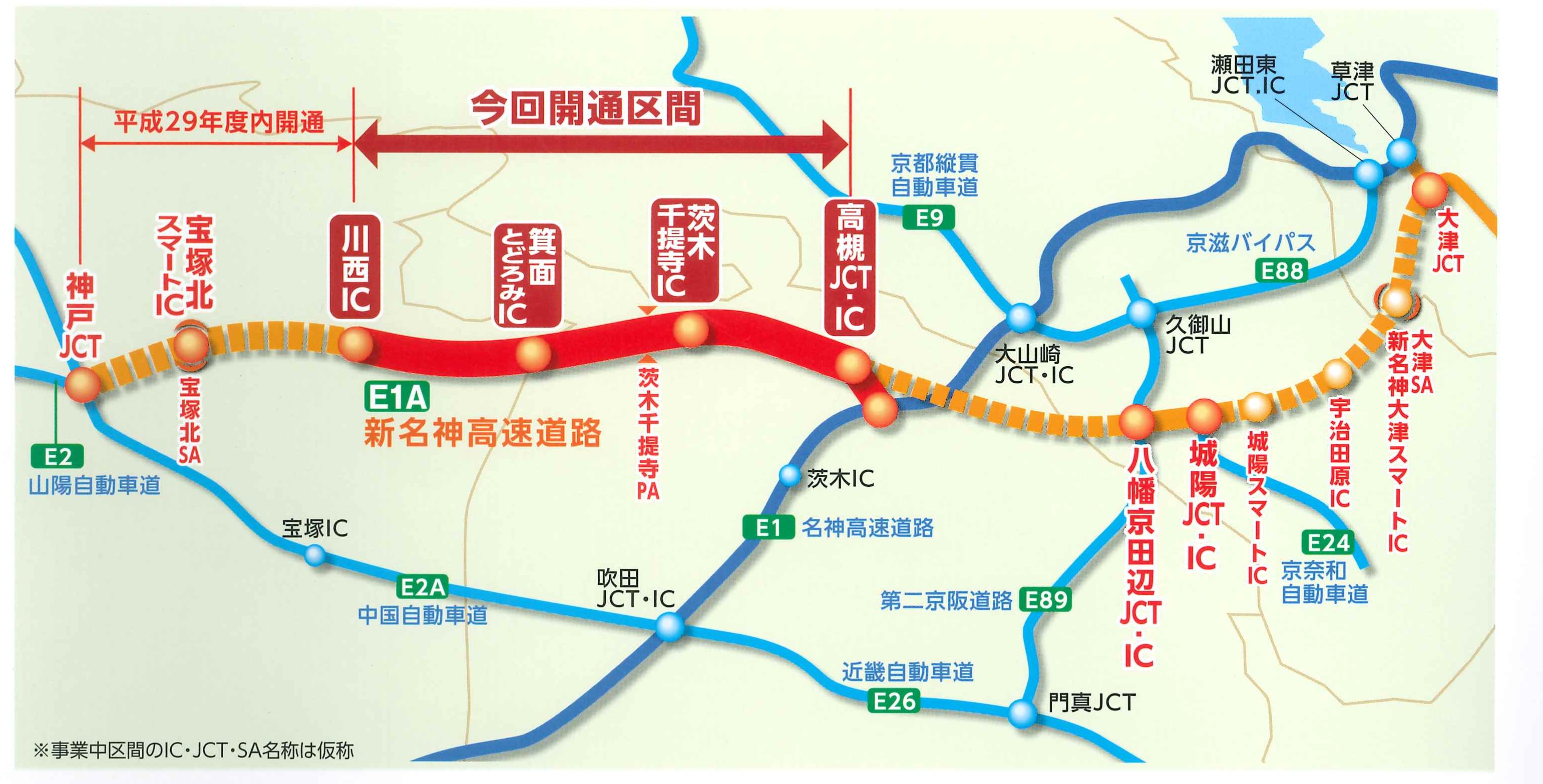 来賓として松井一郎大阪府知事の代理で出席した竹内広行副知事は松井知事のあいさつを代読「新名神高速道路は東西の二極を結ぶ新たな国土軸としてわが国の産業や経済活動を支え国際競争力の強化に大きく貢献する広域交通インフラだ。大阪府域ではすでに彩都や箕面新町をはじめ沿線地域に物流や生産拠点が相次いで進出しており、今後さらに新たな需要や雇用を創出し経済活性化につながることを期待している。大阪府としても残る区間の1日も早い開通に向けて引き続き関係機関と連携し全力で取り組み高速道路ネットワークをはじめとする交通物流機能の強化に向けてインフラの整備を着実に進めていく。現在、大阪関西では、2025年の万国博覧会の誘致を官民一体となって目指している。万博を通じて大阪関西の活性化はもとより日本全体の経済成長の起爆剤にしたいと考えているので皆様のご支援をお願いしたい」と述べた。