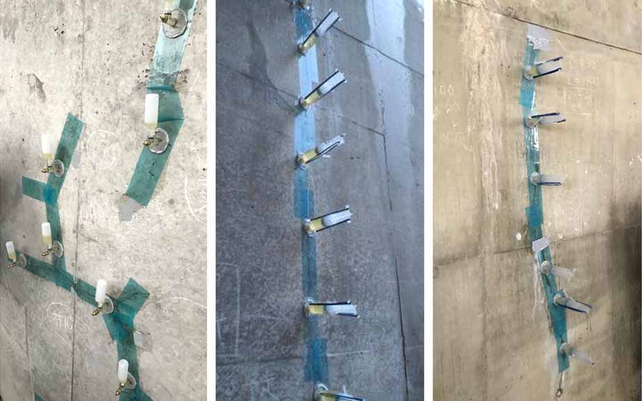 「せこたん」の特徴は、青色半透明のシールテープであること。養生時間は春~秋で30分程度、冬でも1時間程度と従来に比べて短い。半透明なので補修材の注入状況を施工しながら視認できる。施工後の剥離も手やスクレーパーで簡単に剥離できる。また、長さ方向に50mm間隔で目盛りのような筋が付いているので、注入座金固定の位置を決めやすいというメリットも備えている。反面、アクリル樹脂系の注入材は、せこたんと接触すると硬化が遅くなるため、使うことは難しく、エポキシ系の低圧注入工法のみを対象としている。