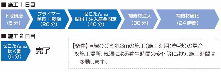 施工手順および所要時間は下図の通り。せこたん自体の施工は注入座金の固定まで合わせて1時間前後しかかからない。施工後の剥離は約5分程度で完了する。