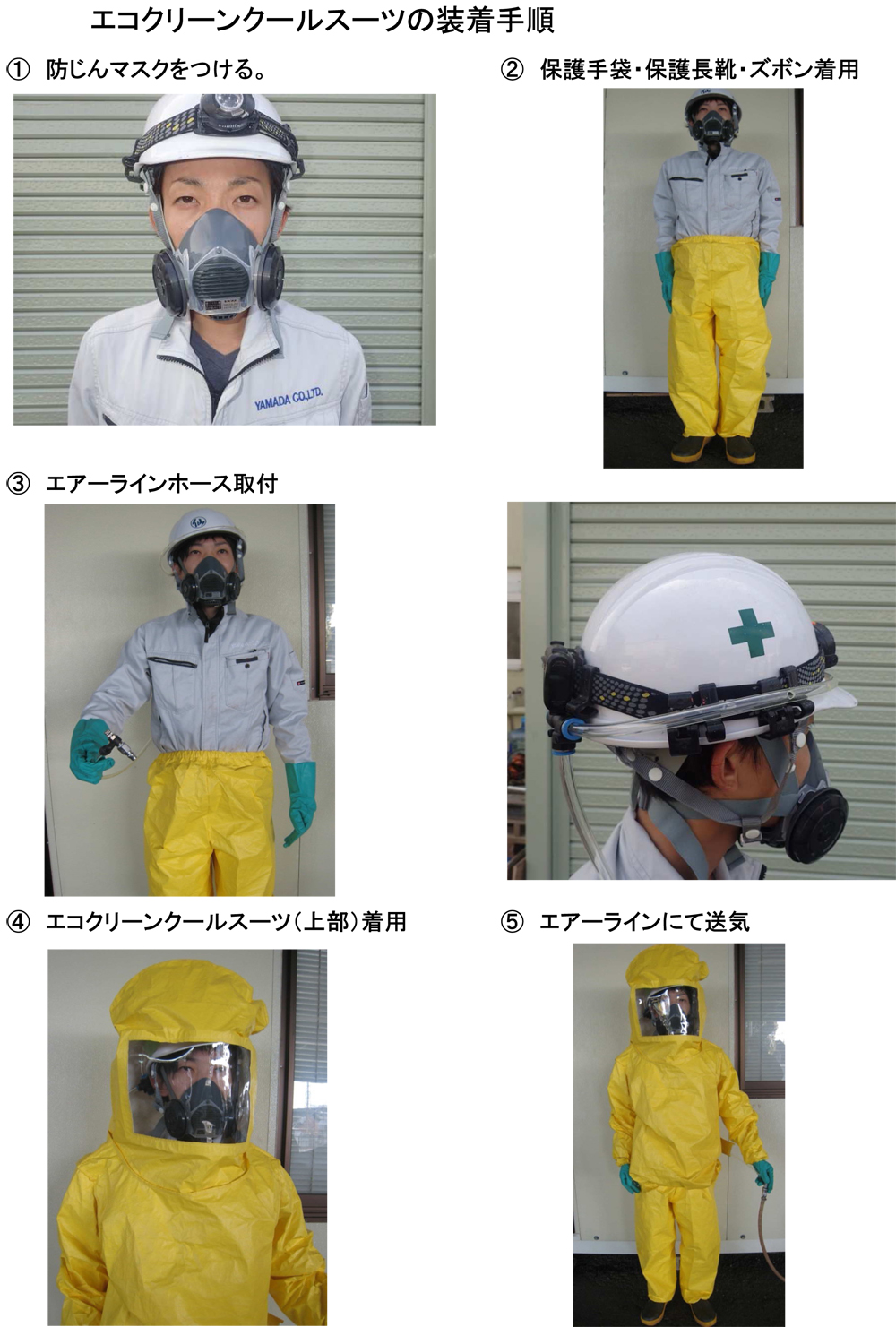 エコクリーンクールスーツは、強靭かつ軽量で柔軟性も有しており、優れた作業性が確保できる。スーツは腰部や手首部をゴムで固定し、体を覆っており、作業中に有害粉塵が身体へ付着することはなく、空気を外気導入孔から供給し、排気孔から出すが、排出の際も外部よりも高い空気圧で排出し続けることから、物理的に外部の有害な粉塵が、スーツ内に入ることの無いようにしている。スーツ内が暑くなる時には、クールジェットX(音速に近い速度のエアー渦巻きを管内で作って、空気を冷気と暖気に分離し、冷気を体へ送る身体クーラー)を装着することでスーツ内に冷気を送り込み、快適な作業環境を維持することが可能だ。