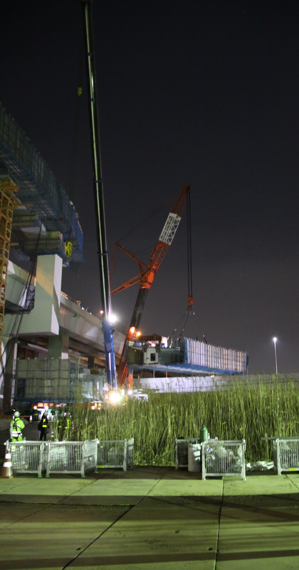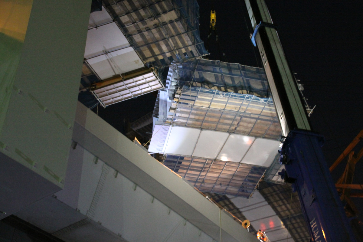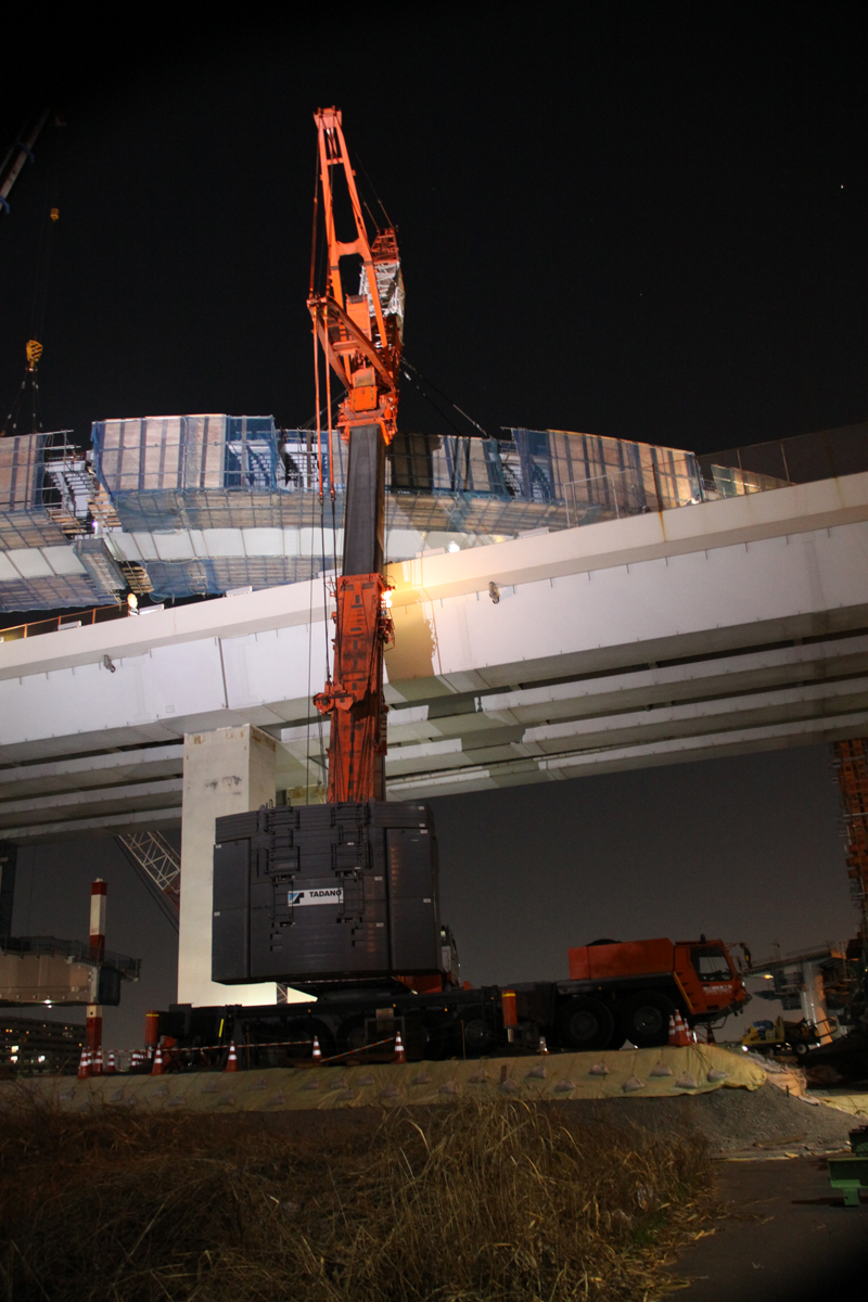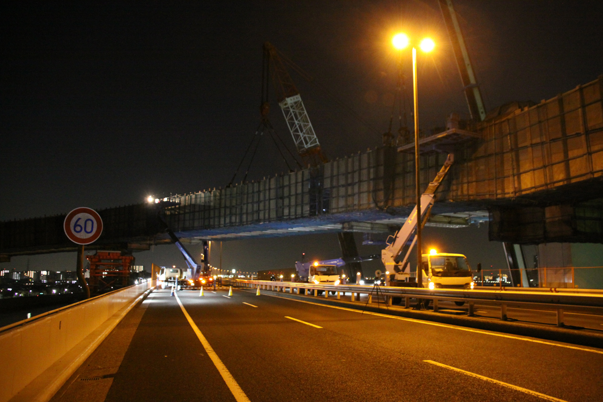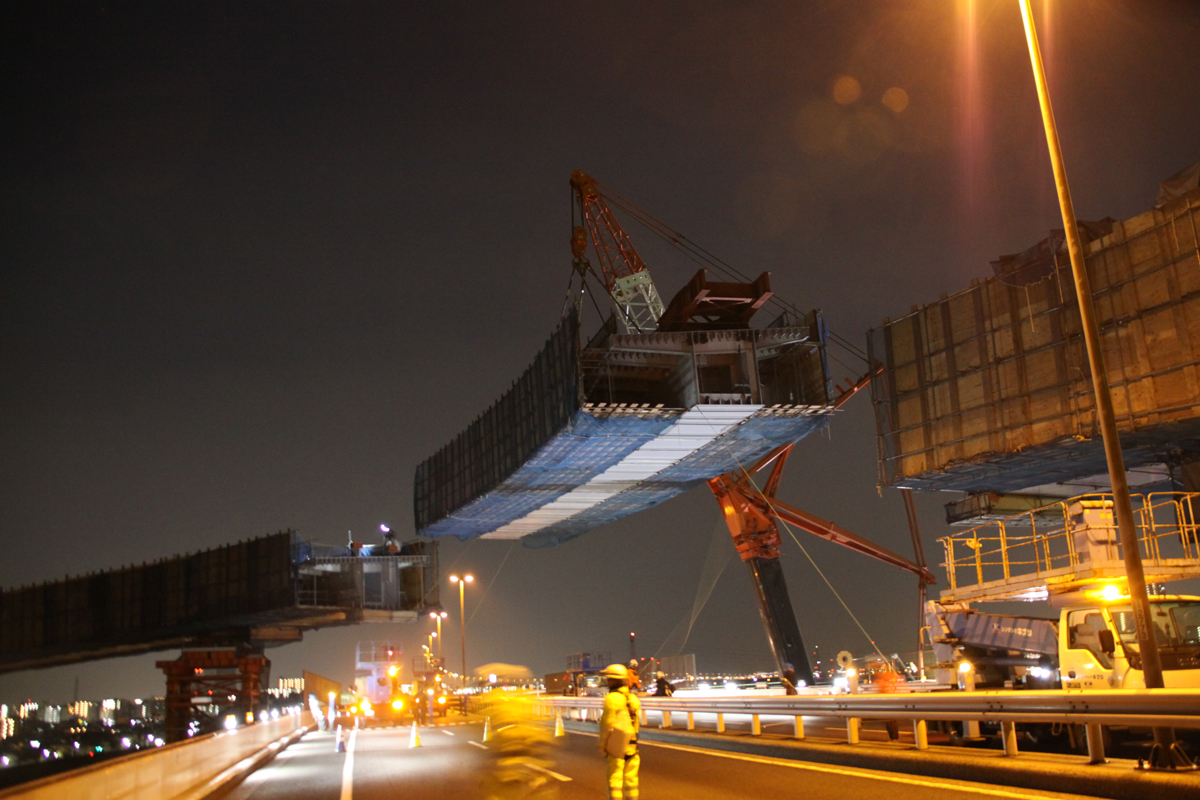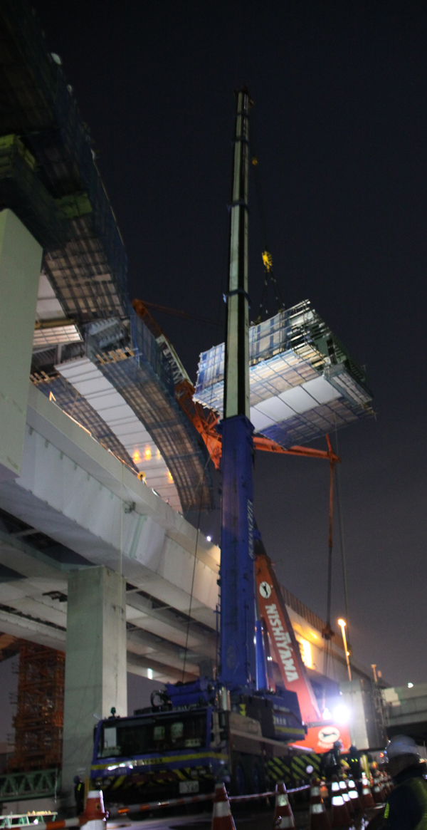 27日当日の夜間架設は、中央環状線の船堀橋~平井大橋間を22時~翌5時までの間、全面通行止めして行われた。当初はJ15~J16ブロック(ブロック長8m)を2月13日、J16~J19(ブロック長29m)を27日に行う予定だった。しかし、13日の架設は大雪の影響で断念。予備日も同様に流れてしまい、急遽27日に、両ブロックを架設することになった。今回架設する部分は、曲線が厳しい箇所で、本来ならJ15~16ブロックを架設した後、昼間に仕口を詳細に計測して、必要な処置を行い次の架設を行うものだが、今回は同ブロックを架設した後に短時間で計測し、J16~J19ブロックを架設しなければならない難易度が高い施工となった。「仕口合わせに時間を要した時は、最悪の場合、J16~J19ブロックを一度降ろして詳細に計測し、翌日深夜以降にもう一度架設する」(首都高速道路)ことも考慮に入れていたが、実際はスムーズに架設することができた。