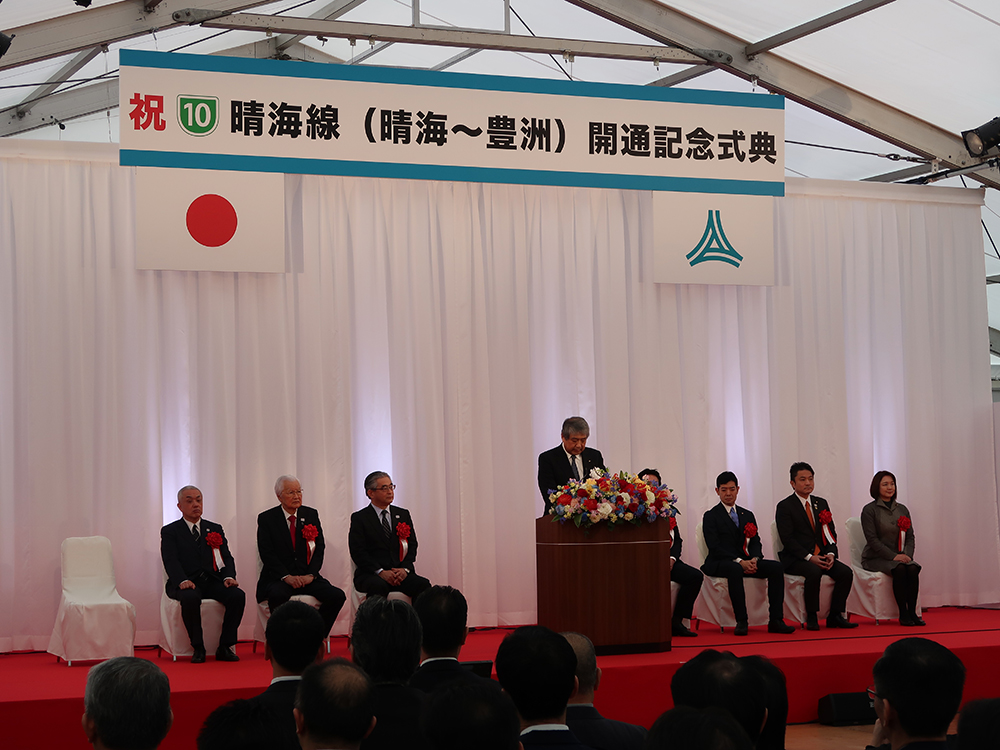 首都高速道路の宮田年耕社長は冒頭の挨拶で、「開通により、臨海部と都心のアクセスが強化され、より便利で快適な暮らしを提供できることを期待している。具体的には、有明通りや晴海通りなど晴海地区全体の混雑緩和に寄与するとともに、晴海地区と羽田空港のアクセスが向上するなど、所要時間の短縮も見込まれる。また、晴海線は湾岸線と都心をつなぐ深川線や台場線に加えて、都心に向かう第3のルートとなり、事故や災害による突発的な通行止め発生時の迂回や、渋滞などの交通状況にあわせたルート選択も可能になる。さらに災害発生時における救命活動や物資輸送に重要な役割を果たすことを期待している」と述べた。