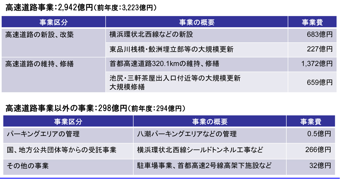 高速道路事業費が昨年度(3,223億円)に比べて減少したのは中央環状線の機能強化などを目的として取り組んでいた板橋・熊野町JCT間拡幅、堀切・小菅JCT間拡幅などの事業が完成し、事業が一服したため。今年度は、横浜環状北西線などの新設に683億円、東品川桟橋・鮫洲埋立部などの大規模更新が227億円、一般維持修繕に1,372億円、池尻・三軒茶屋出入口付近などの大規模更新・大規模修繕に659億円を充てる。