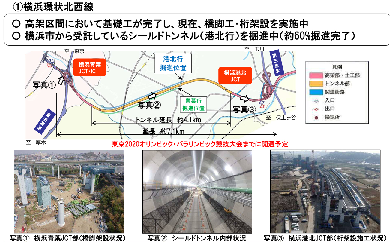横浜環状北西線は、高架部においては基礎をすべて完了し、橋脚や桁架設を全面展開している。またシールド工事トンネル(港北行き)も順調に掘進が進んでおり、全体の約60%まで完了している状況だ。引き続き東京五輪までの完成を目指し工事を進めていく。