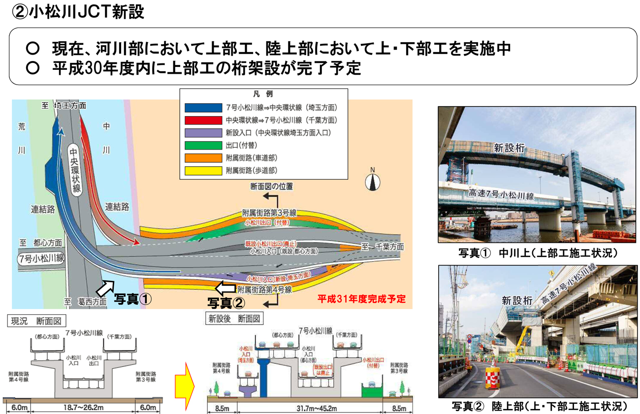 中央環状線や7号小松川線の機能向上を目的に建設を進められている小松川JCT新設工事については、現在は河川部の上部工、陸上部で上下部工を建設しており、今年度中に上部工の架設が完了する見込みで、平成31年度の完成を目指す。