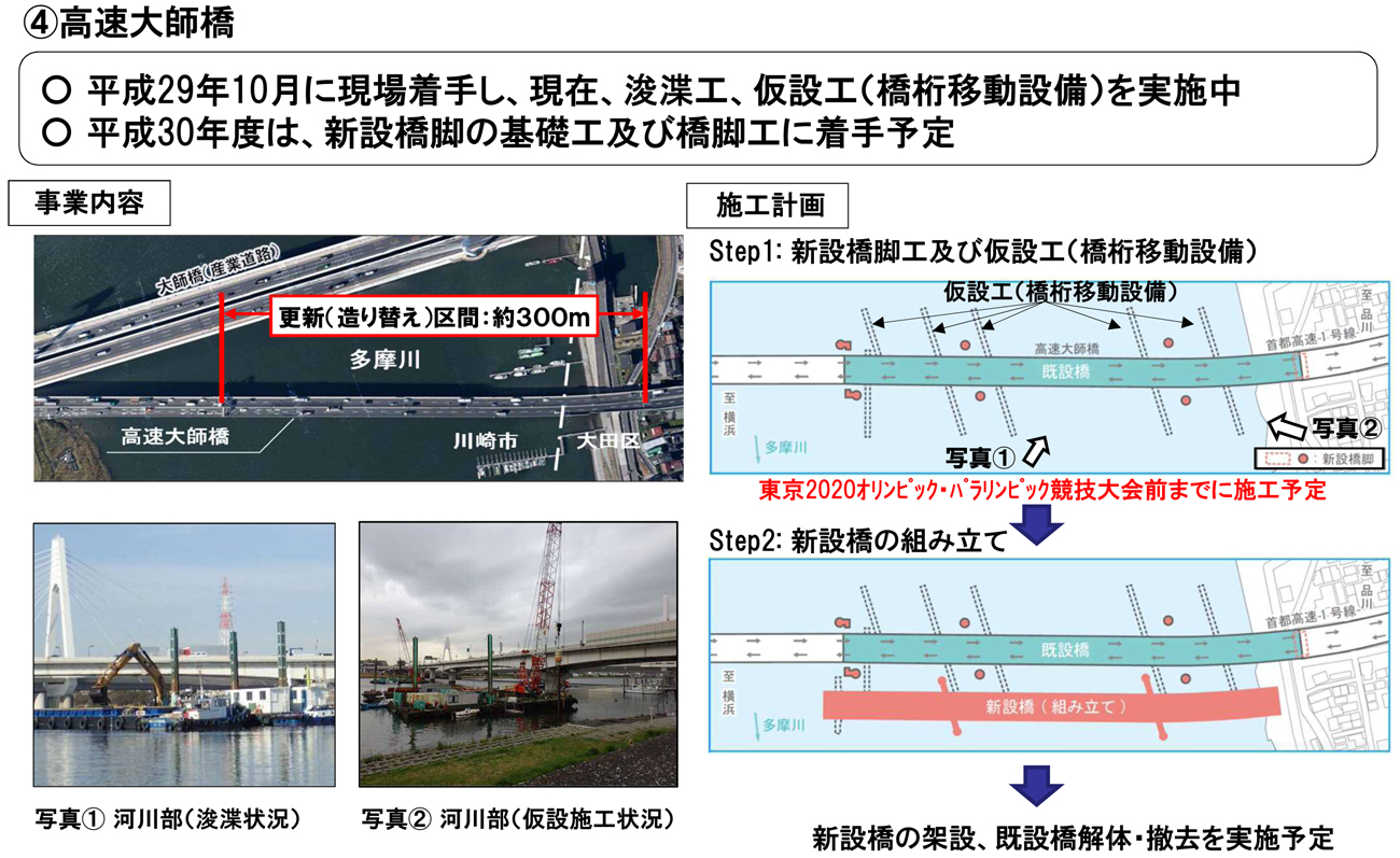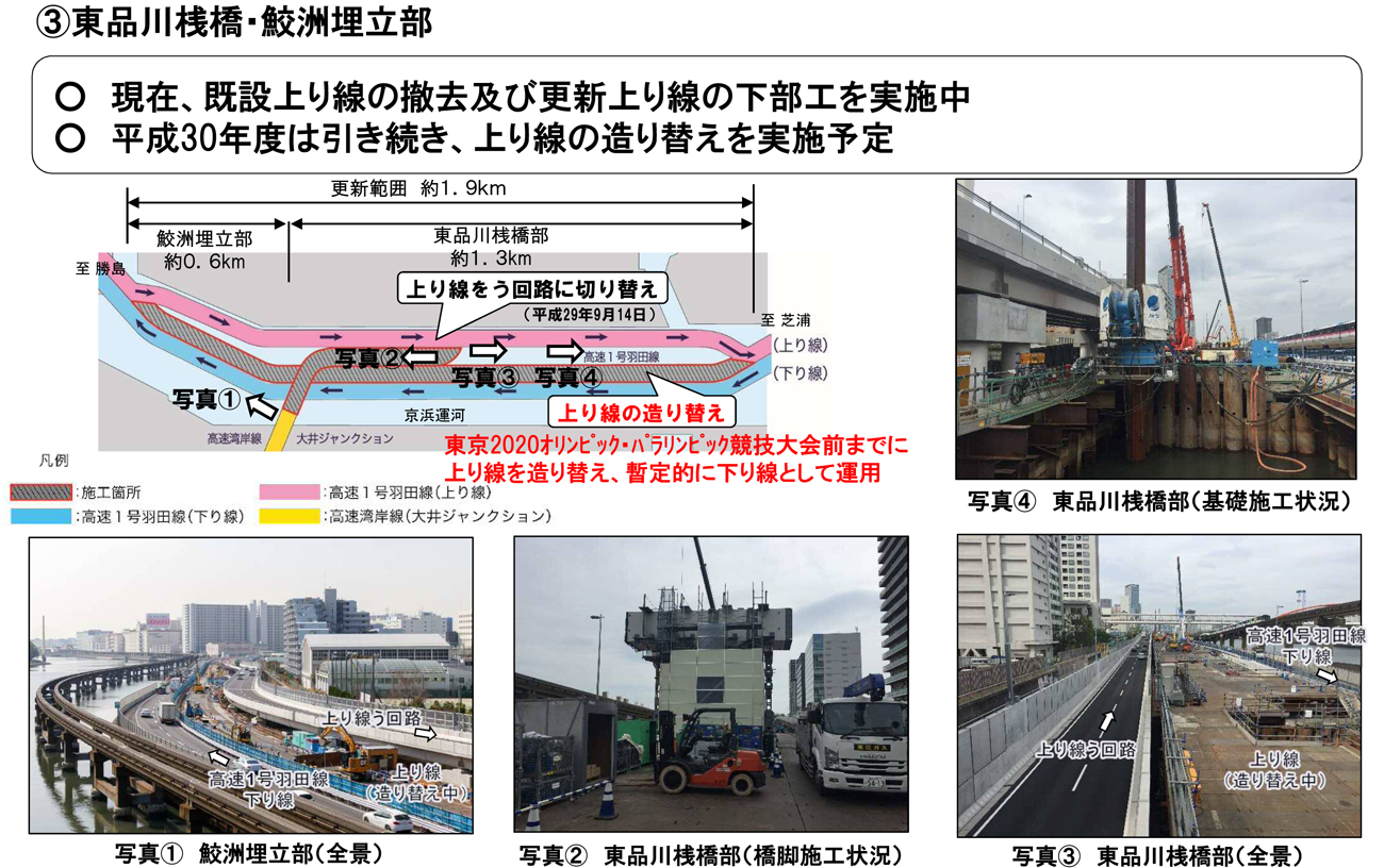 1号羽田線東品川桟橋・鮫洲埋立部の大規模更新については、既設上り線の撤去および更新上り線の下部工を今年度も引き続き実施していく。東京五輪前までには上り線を作り変え、暫定的に下り線として運用し、東京五輪は現在の迂回路(上り線として活用)と共に運用していく。高速大師線については、平成29年10月に現場着手し、今年度は新設橋脚の基礎および橋脚工に着手する予定だ。東京五輪までに新設橋脚と橋桁の移動設備の構築を完了させる方針。