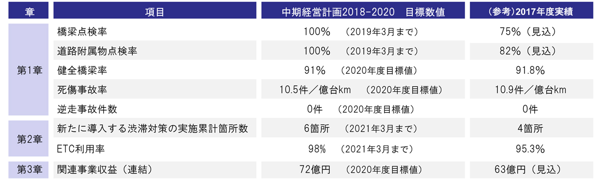 同日には2018―20年の中期計画も発表した。取り組み方針は①安全・安心の追及、②快適・ベンチなサービスの提供、③新たな事業領域への挑戦、④技術開発の推進、⑤経営基盤の強化、からなっている。橋梁点検および道路付属物の点検率を完了させるほか、健全橋梁率については現在と同水準を保つ。ただし修繕着手済み橋梁数は2017年の13橋(499径間)が48橋(2,453径間)、要修繕橋梁数は23橋(532径間)が51橋(3,093径間)と大幅に増加する見込みで、補修に関する費用は大幅な増加が見込まれる。新たに導入する渋滞対策の実施累計箇所数も6箇所に増やす方針。技術開発については毎年10件程度を目標にしていく。