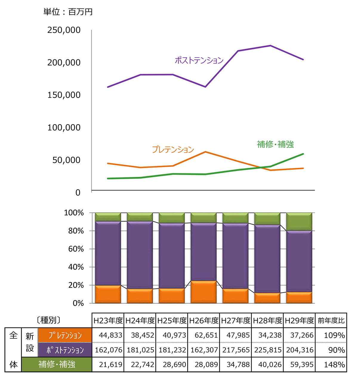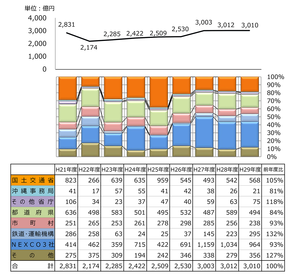 受注高の内訳は、新設が前年度比93%の約2,416億円に留まる一方、補修・補強は前年度比148%の約594億円に増加した。機関別内訳は国が約664億円と前年度比約5%増加した一方、都道府県が約494億円(前年度比16%減)、市町村が約238億円(同7%)とそれぞれ前年比減となった。鉄道・運輸機構は約295億円と同32%の大幅増。NEXCO3社は約964億円と同7%の減少となったが、これは新設が約518億円と前年度から約272億円減少したことが大きい。大規模更新事業は446億円と前年度から244億円増加している。