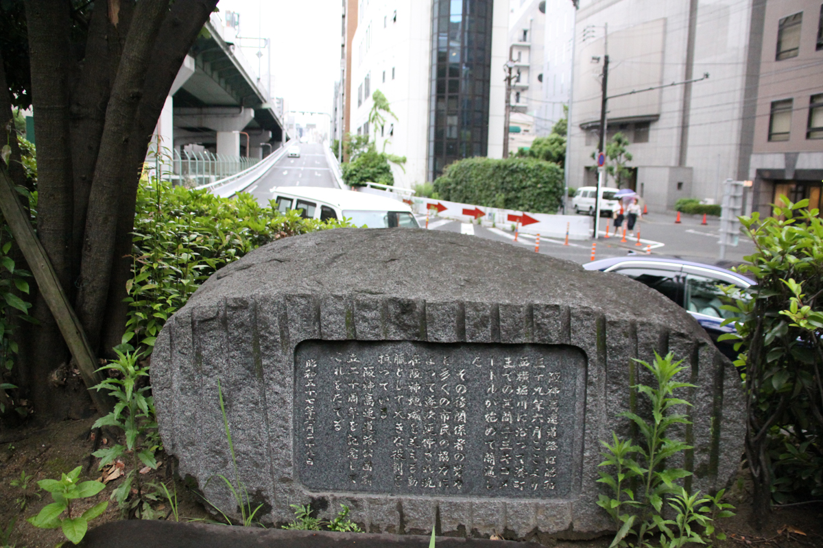 土佐堀ランプ付近にある、阪神高速道路初供用区間を示す石碑