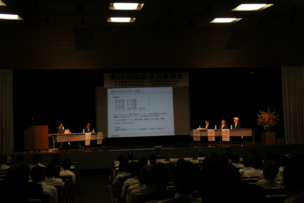 特別セッションでは、記念座談会も開催された。森本励計画部長、上松英司経営企画部長、加賀山泰一技術部長、川北司郎保全交通部長、田代千治経理部長が、自らの若かりし頃や、大和川線の計画、阪神淡路大震災などの経験、専門分野で感じたことを振り返りながら「若手技術者に伝えたいこと・大事にして欲しいこと」について座談した。