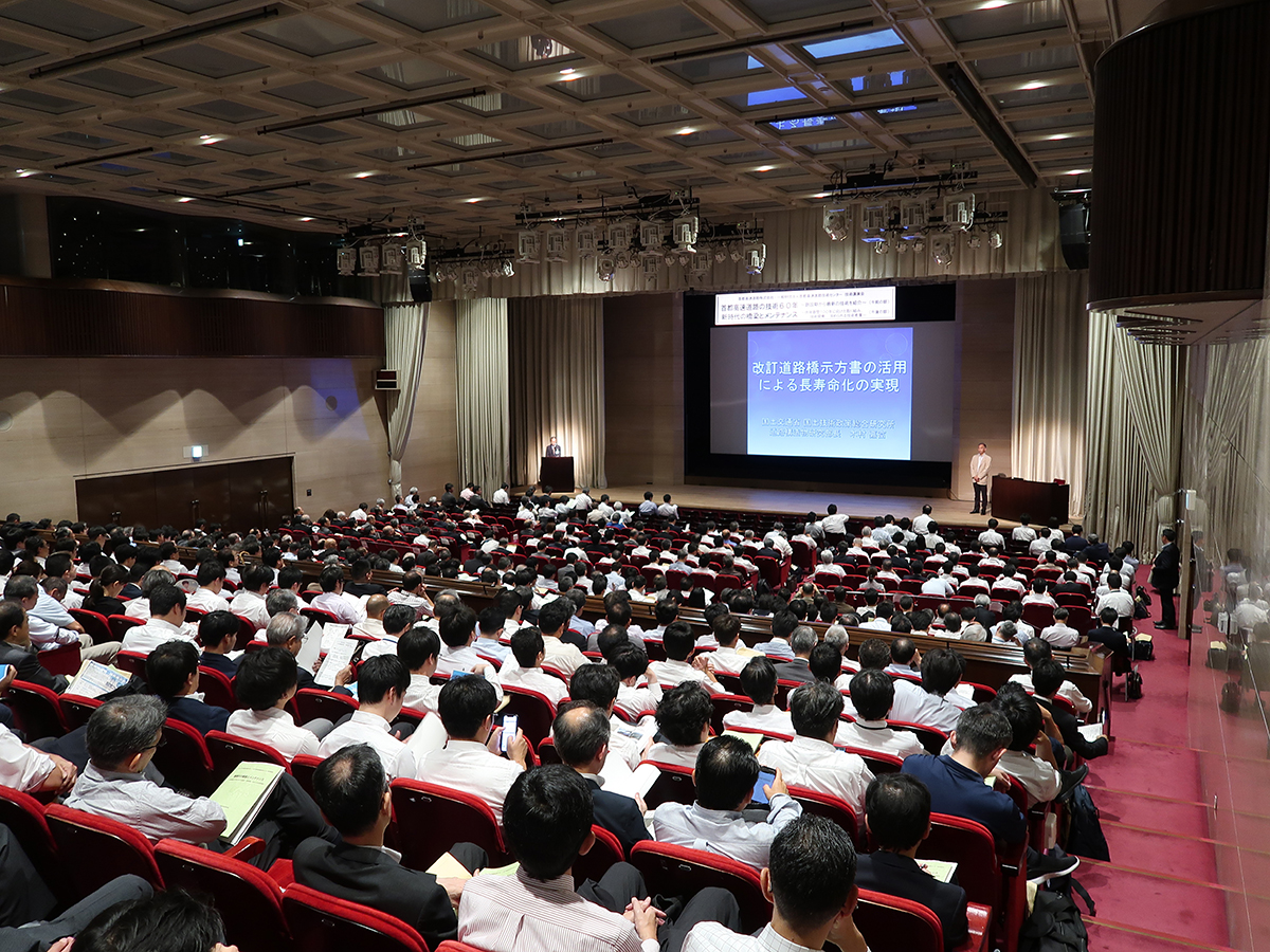 講演会は午前と午後の二部制で行われ、グループ会社をはじめ官公庁、施工業者などから延べ約900名が出席した。午前の部では「首都高速道路の技術60年」と題し、首都高の技術者が創設期から最新の技術までを紹介した。田嶋仁志土木技術担当部長は創設期の鋼橋の技術として、高張力鋼の使用やラーメン橋脚・ラーメン構造の採用などを説明。新技術では、横浜環状北線新横浜付近高架橋を例にポンプ圧送打設による膨張剤併用軽量コンクリート床版橋の建設をあげた。