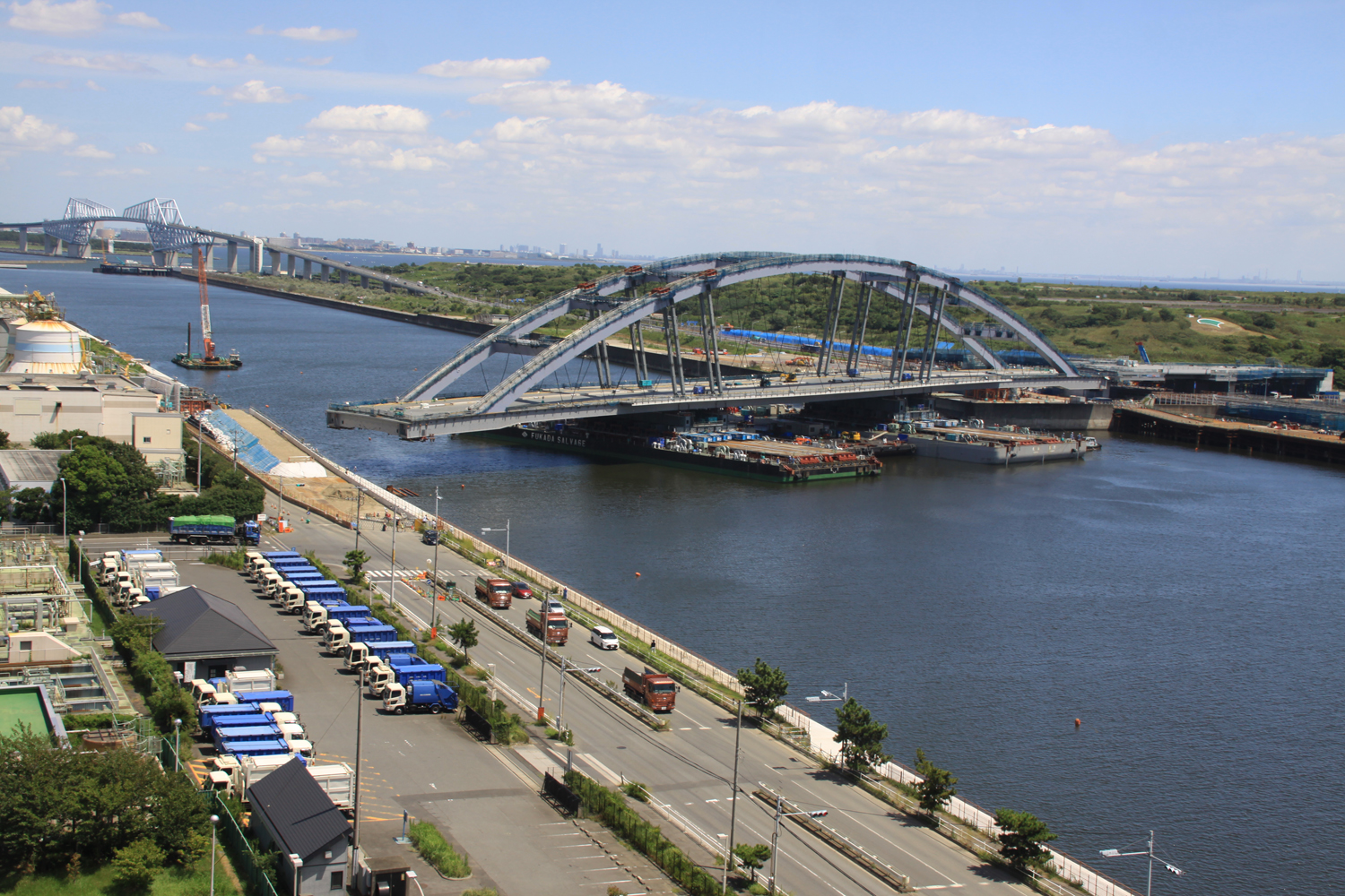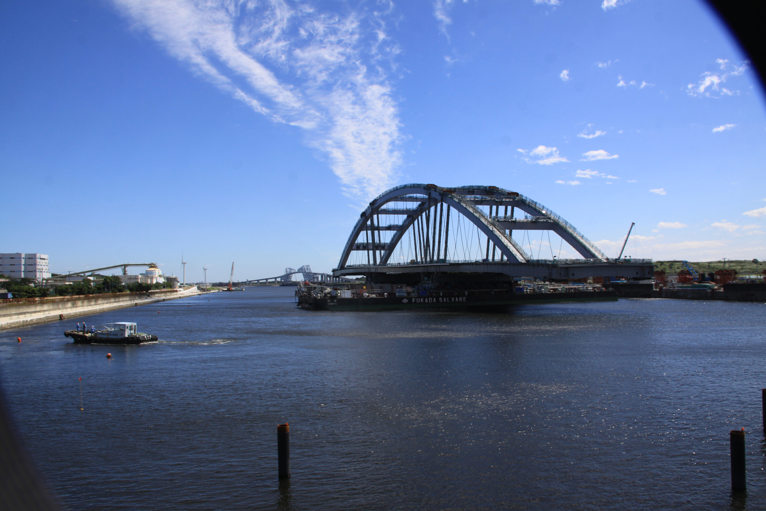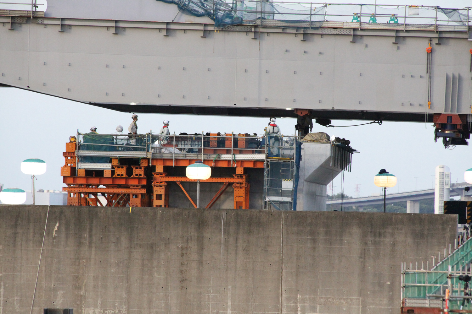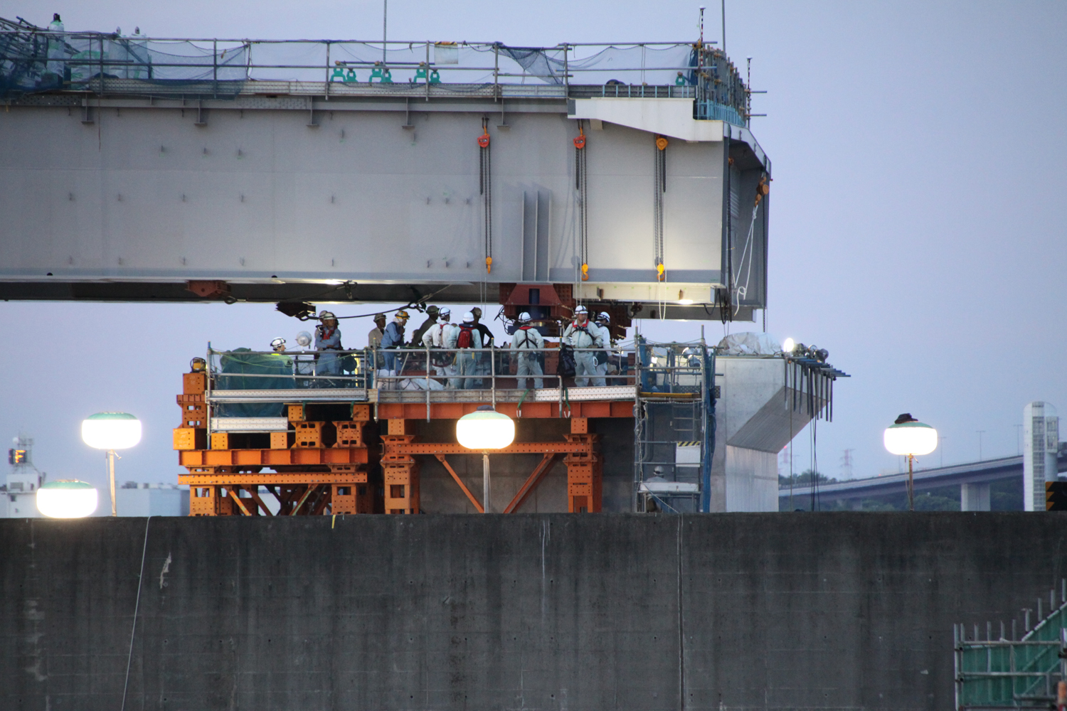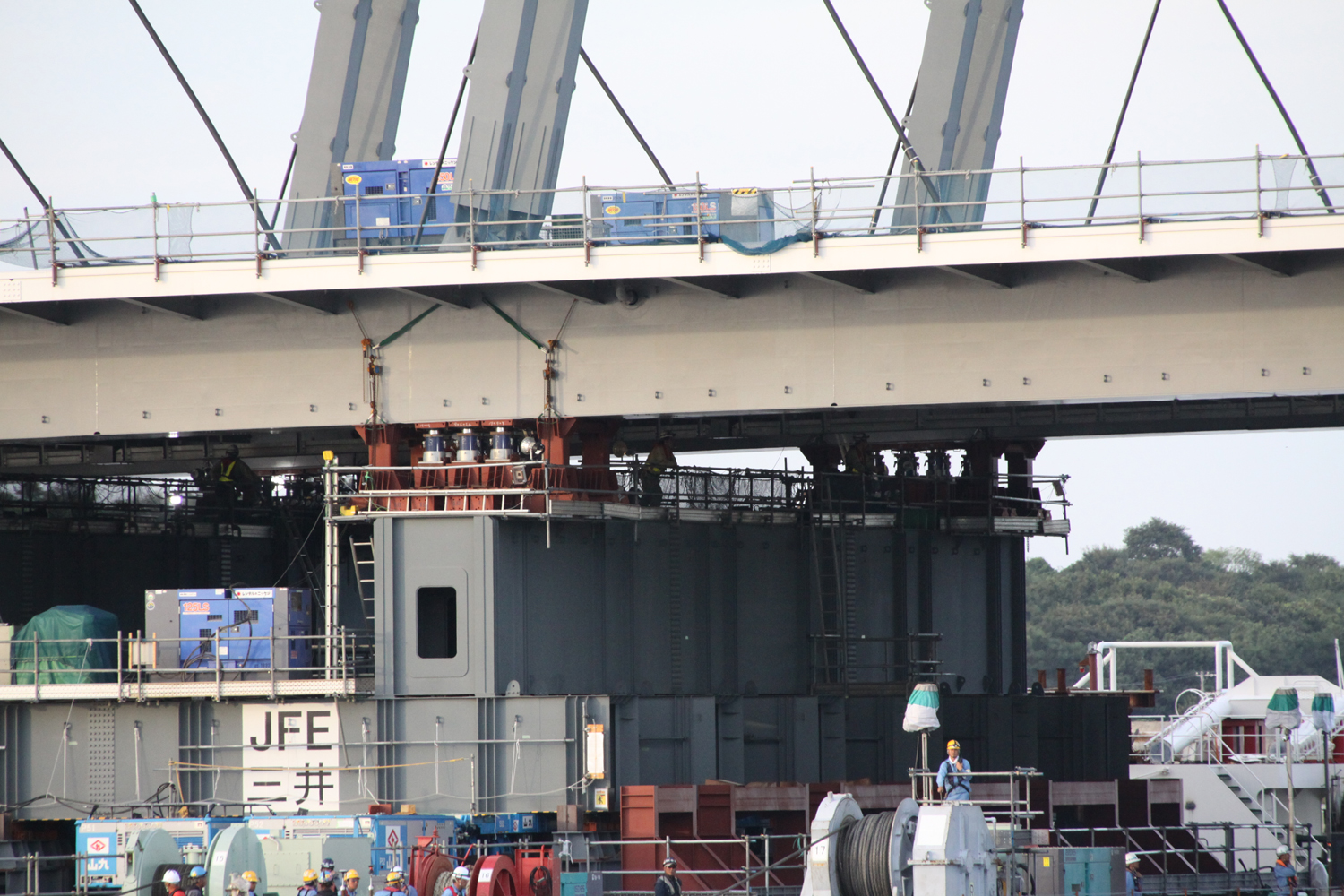 東京都港湾局は、17日から20日にかけて、2台の大型台船を用いた東西水路横断橋(仮称)の桁架設およびジャッキダウンを行った。架設地は、以前に中潮橋が供用されていた個所とほぼ同じ位置。東京都と国土交通省が建設を進めている臨港道路南北線および接続道路事業の一環で、その名の通り東西水路を跨ぐ橋梁。15日の段階で離岸していたが、17日に架設地近くまで400m航行した。当初同日に架設地の線形に合わせて桁を回転させる予定だったが、強風の影響で中止した。  18日午前中に桁を86度回転させて実際に架ける橋軸と同じ角度にした。さらに53mほど架設地点まで接近し、潮待ちして18時半ごろから微調整を開始、橋軸直角方向に8.5m、橋軸方向に4mほど動き、深夜12時半には荷重を台船からA1およびP1に移し替え、台船が退出した。縦断勾配はA1側に大きく、A1側2.7m、P1側0.8mを夜間に少しずつ下げていった(ジャッキストロークは150mm)。