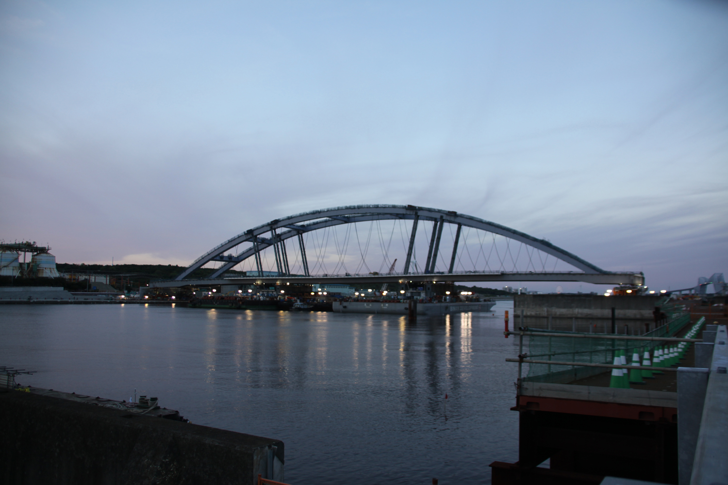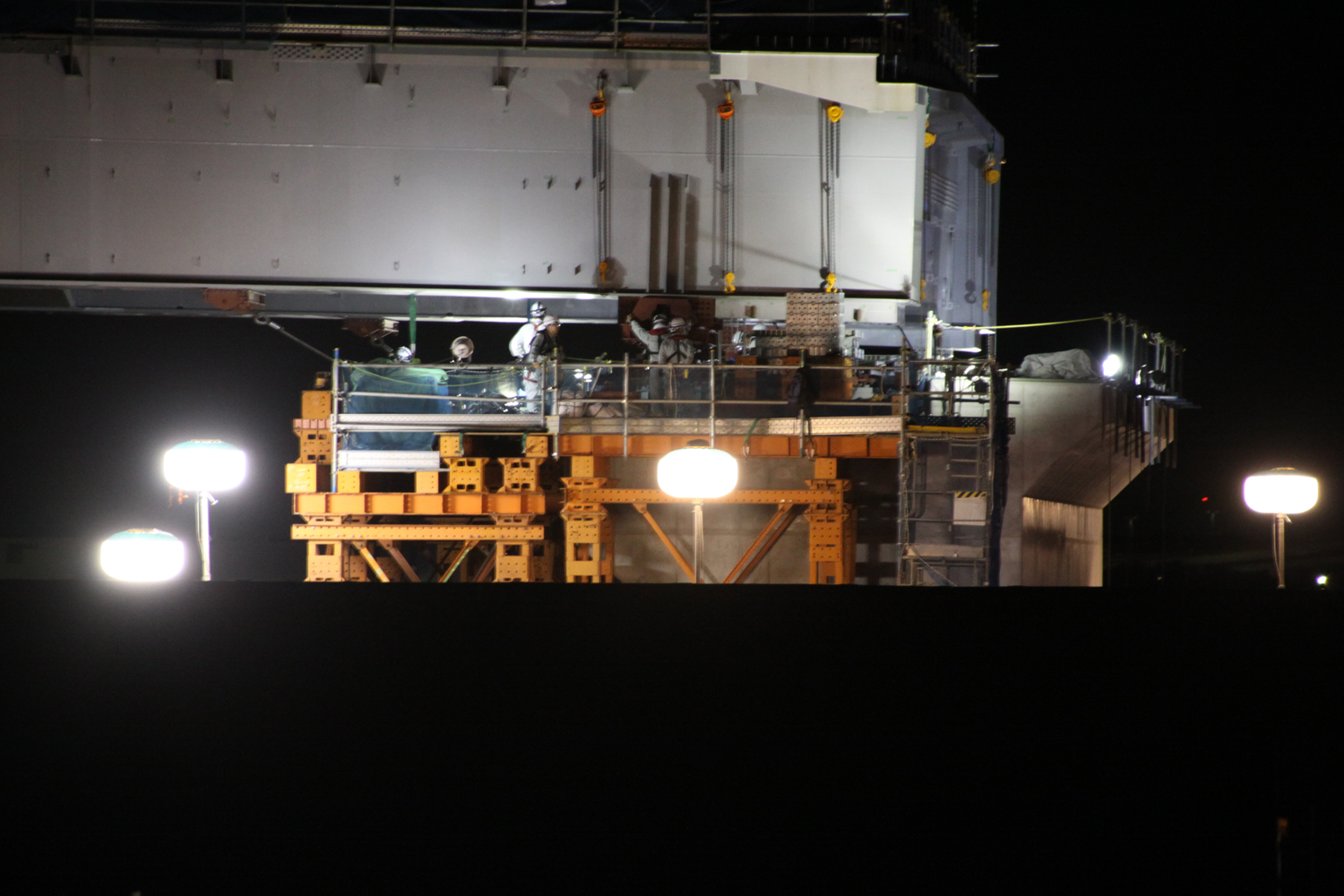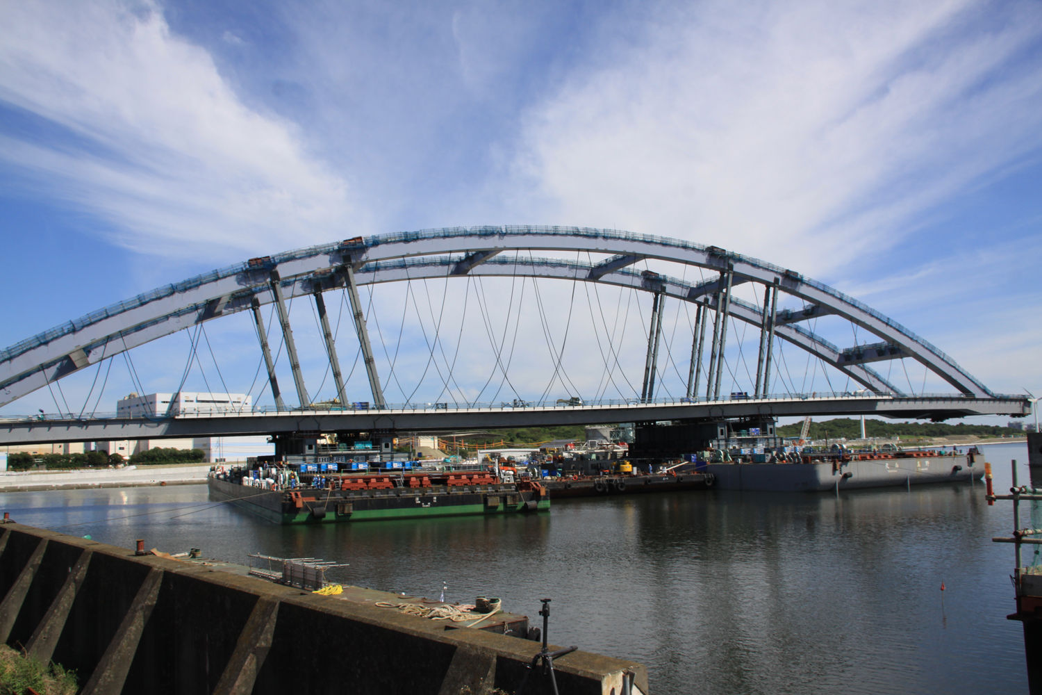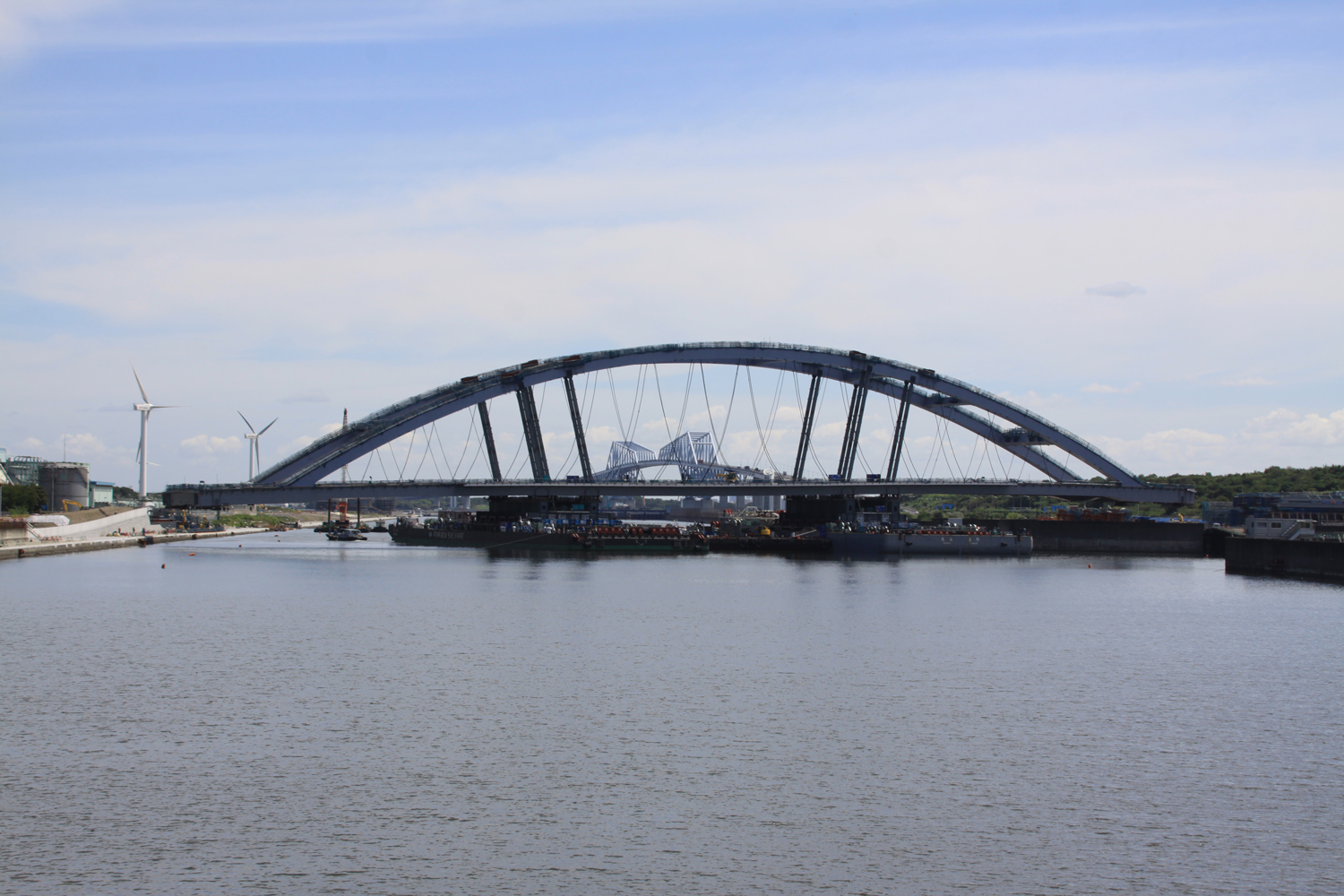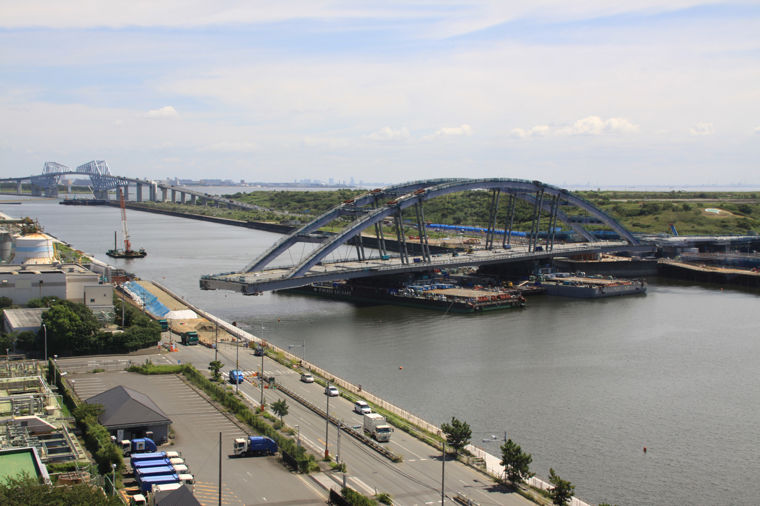 東京都港湾局は、17日から20日にかけて、2台の大型台船を用いた東西水路横断橋(仮称)の桁架設およびジャッキダウンを行った。架設地は、以前に中潮橋が供用されていた個所とほぼ同じ位置。東京都と国土交通省が建設を進めている臨港道路南北線および接続道路事業の一環で、その名の通り東西水路を跨ぐ橋梁。15日の段階で離岸していたが、17日に架設地近くまで400m航行した。当初同日に架設地の線形に合わせて桁を回転させる予定だったが、強風の影響で中止した。  18日午前中に桁を86度回転させて実際に架ける橋軸と同じ角度にした。さらに53mほど架設地点まで接近し、潮待ちして18時半ごろから微調整を開始、橋軸直角方向に8.5m、橋軸方向に4mほど動き、深夜12時半には荷重を台船からA1およびP1に移し替え、台船が退出した。縦断勾配はA1側に大きく、A1側2.7m、P1側0.8mを夜間に少しずつ下げていった(ジャッキストロークは150mm)。