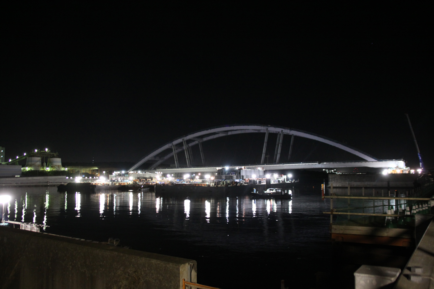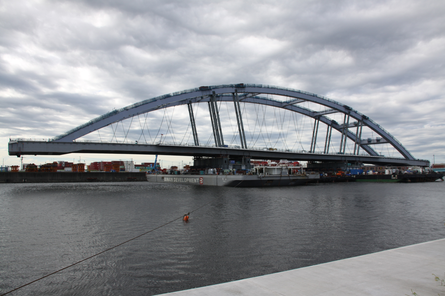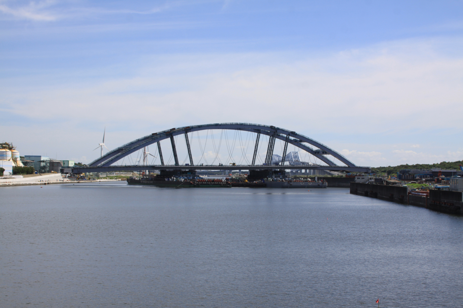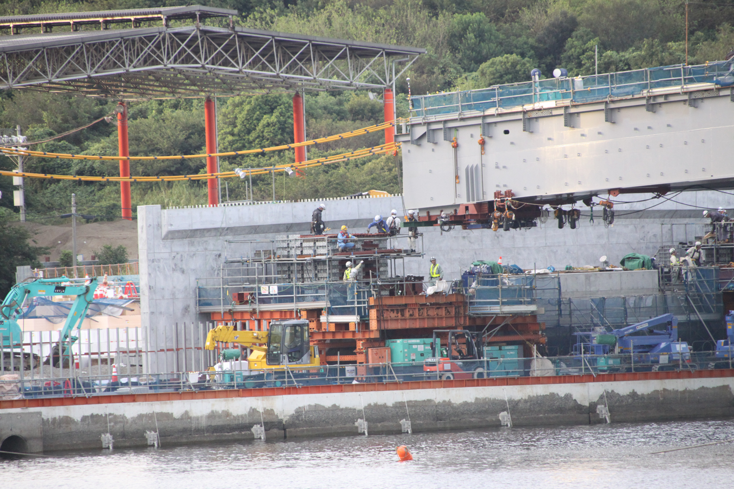 東京都港湾局は、17日から20日にかけて、2台の大型台船を用いた東西水路横断橋(仮称)の桁架設およびジャッキダウンを行った。架設地は、以前に中潮橋が供用されていた個所とほぼ同じ位置。東京都と国土交通省が建設を進めている臨港道路南北線および接続道路事業の一環で、その名の通り東西水路を跨ぐ橋梁。15日の段階で離岸していたが、17日に架設地近くまで400m航行した。当初同日に架設地の線形に合わせて桁を回転させる予定だったが、強風の影響で中止した。  18日午前中に桁を86度回転させて実際に架ける橋軸と同じ角度にした。さらに53mほど架設地点まで接近し、潮待ちして18時半ごろから微調整を開始、橋軸直角方向に8.5m、橋軸方向に4mほど動き、深夜12時半には荷重を台船からA1およびP1に移し替え、台船が退出した。縦断勾配はA1側に大きく、A1側2.7m、P1側0.8mを夜間に少しずつ下げていった(ジャッキストロークは150mm)。