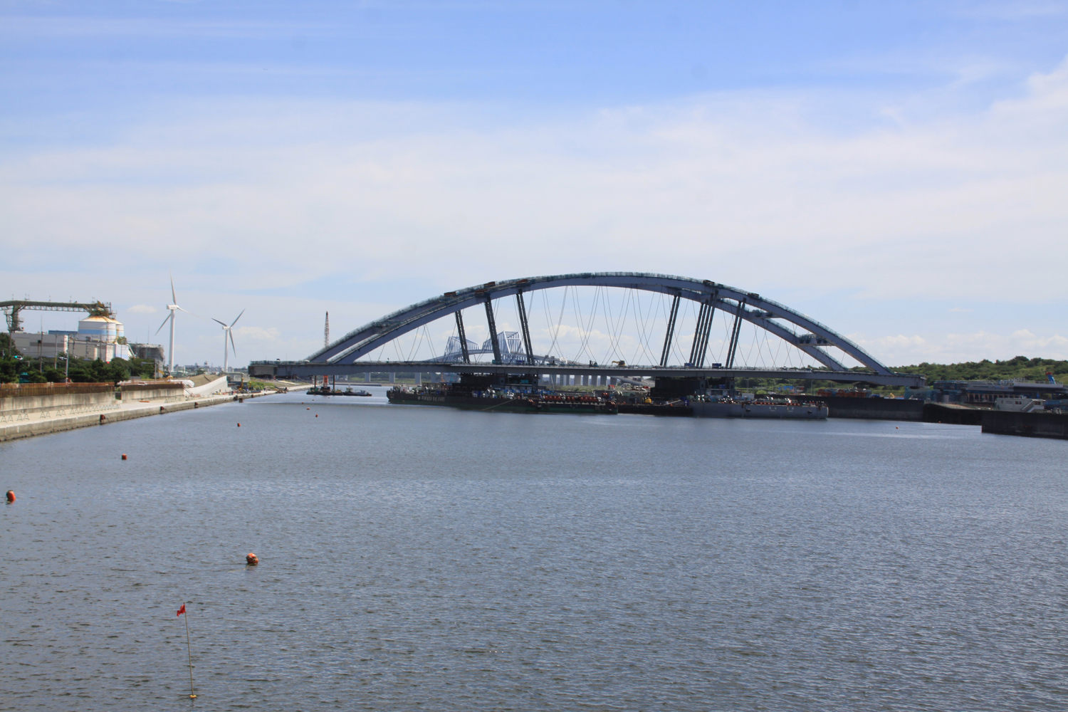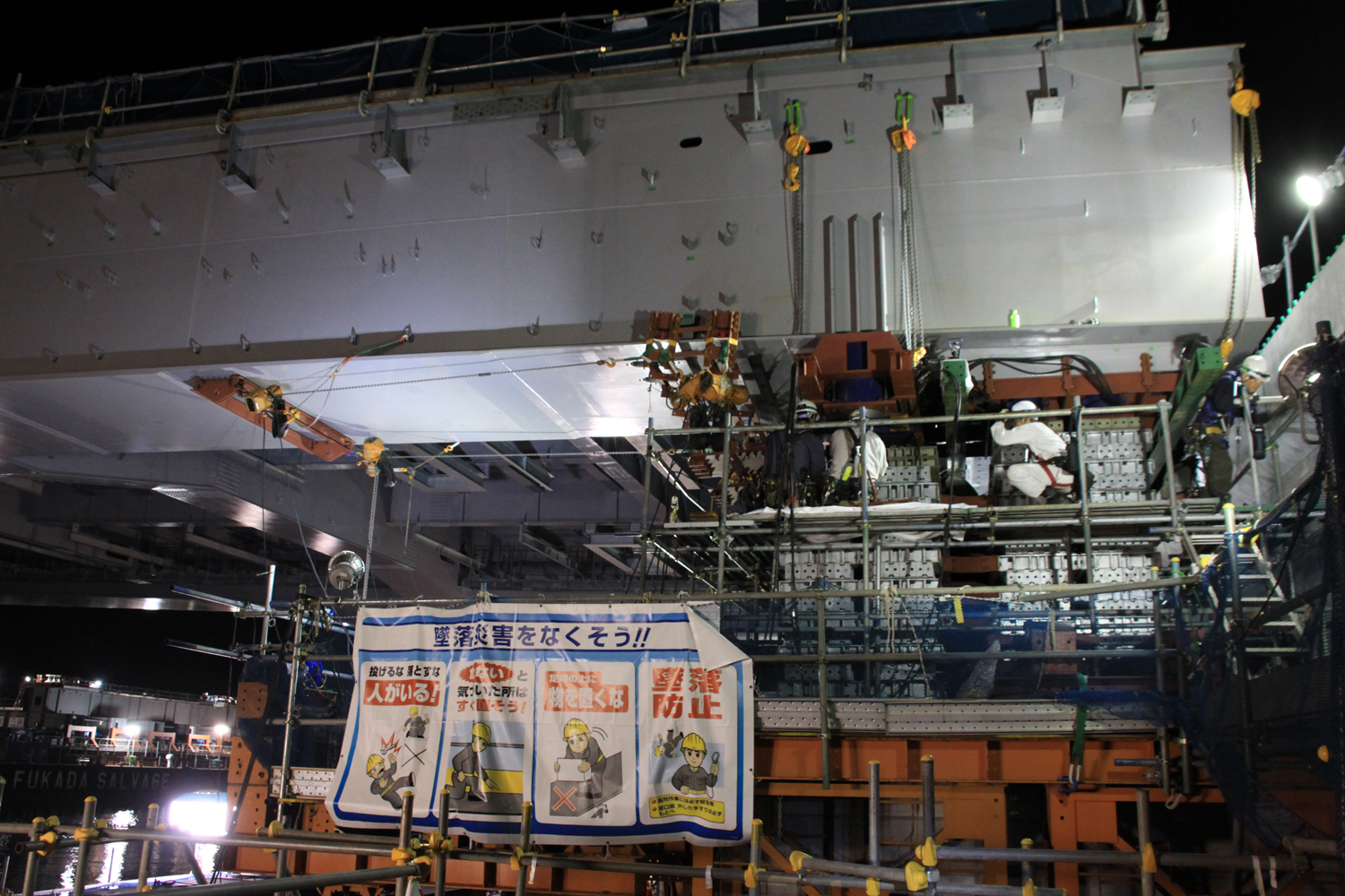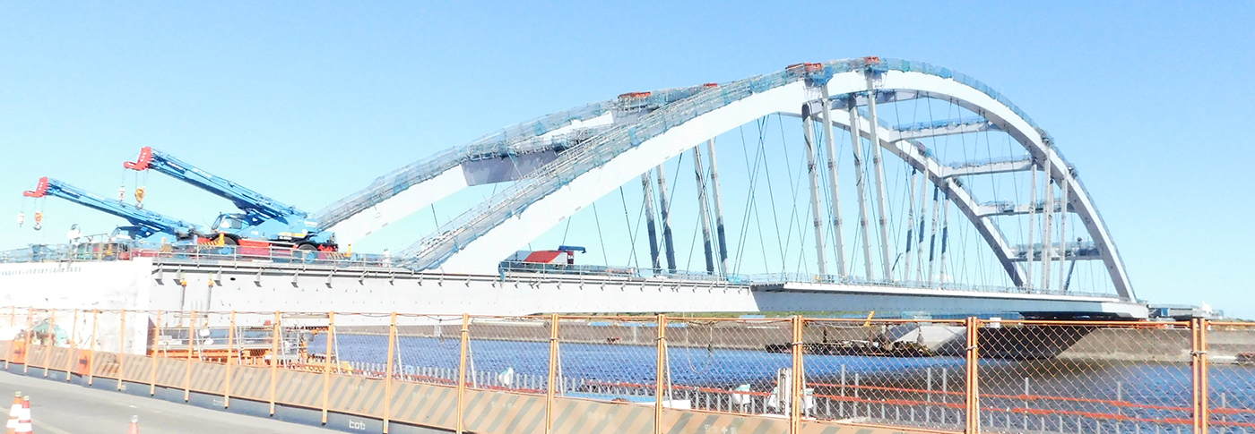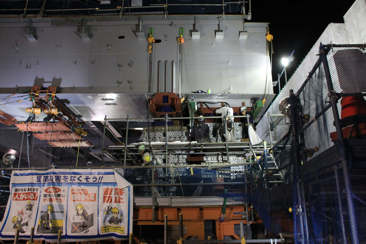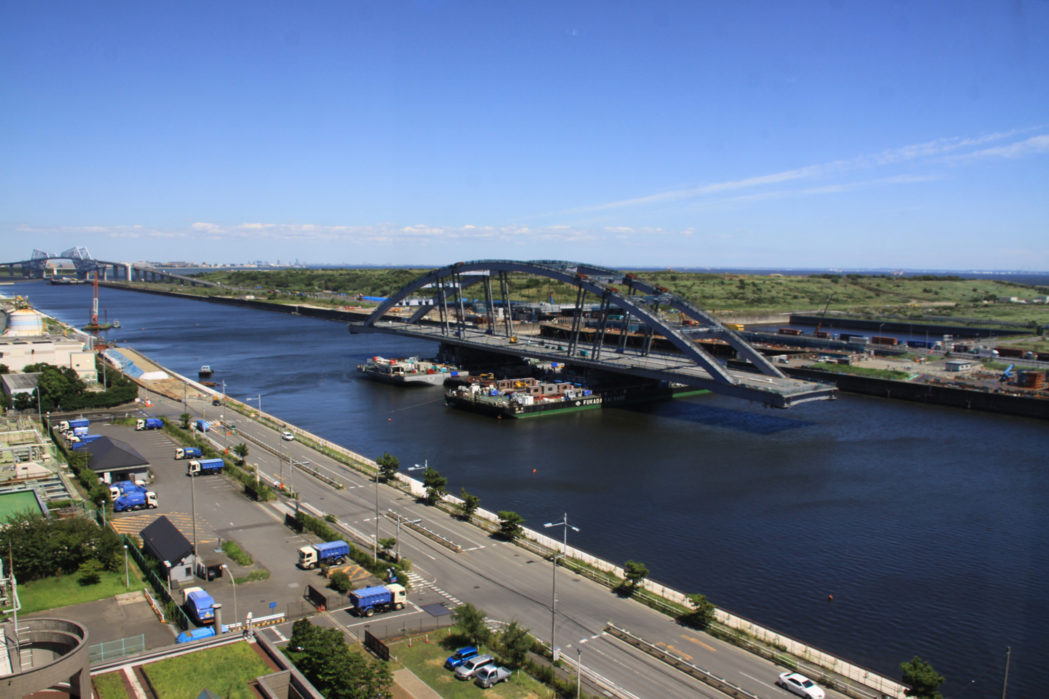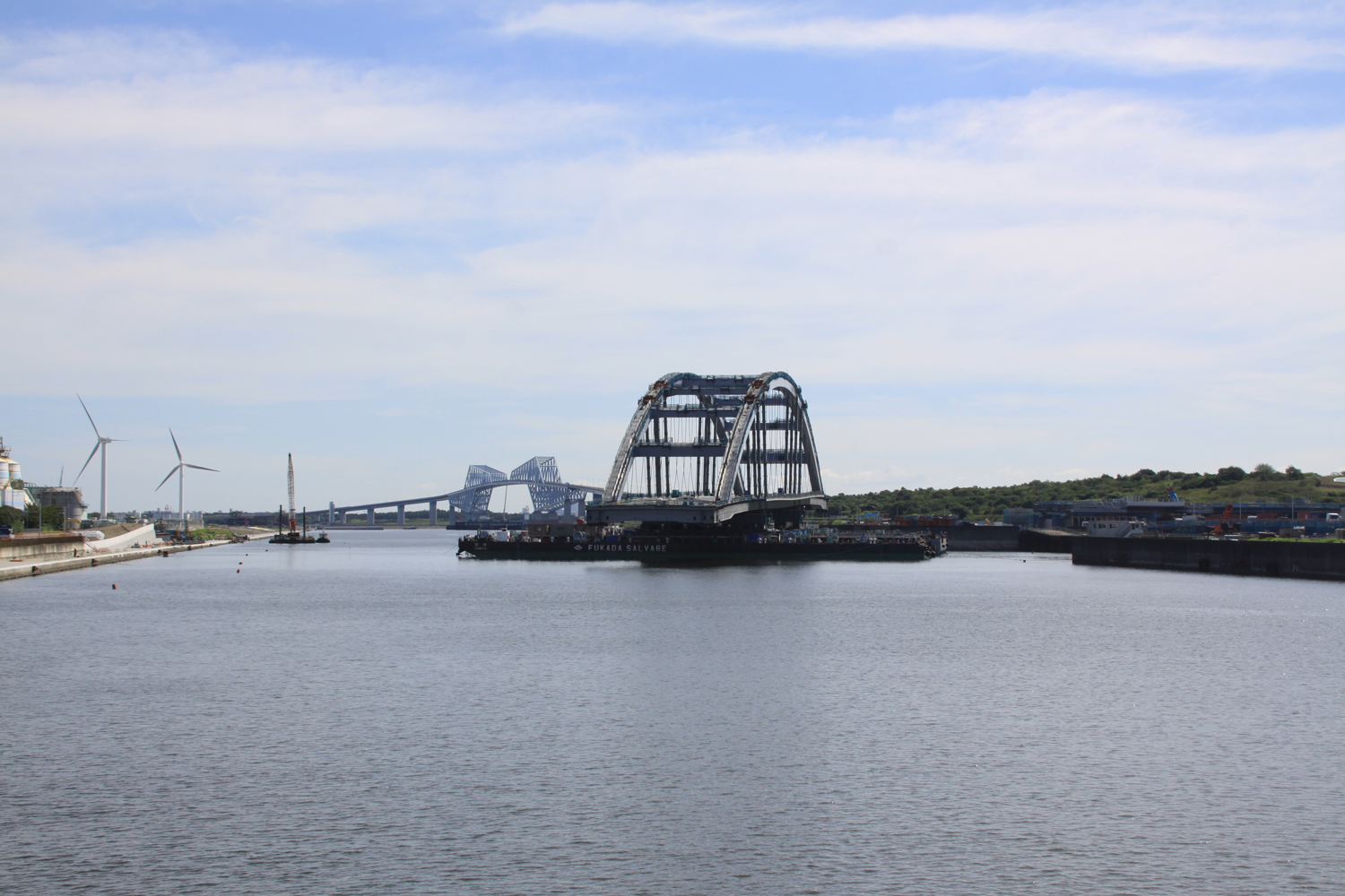 東京都港湾局は、17日から20日にかけて、2台の大型台船を用いた東西水路横断橋(仮称)の桁架設およびジャッキダウンを行った。架設地は、以前に中潮橋が供用されていた個所とほぼ同じ位置。東京都と国土交通省が建設を進めている臨港道路南北線および接続道路事業の一環で、その名の通り東西水路を跨ぐ橋梁。15日の段階で離岸していたが、17日に架設地近くまで400m航行した。当初同日に架設地の線形に合わせて桁を回転させる予定だったが、強風の影響で中止した。  18日午前中に桁を86度回転させて実際に架ける橋軸と同じ角度にした。さらに53mほど架設地点まで接近し、潮待ちして18時半ごろから微調整を開始、橋軸直角方向に8.5m、橋軸方向に4mほど動き、深夜12時半には荷重を台船からA1およびP1に移し替え、台船が退出した。縦断勾配はA1側に大きく、A1側2.7m、P1側0.8mを夜間に少しずつ下げていった(ジャッキストロークは150mm)。