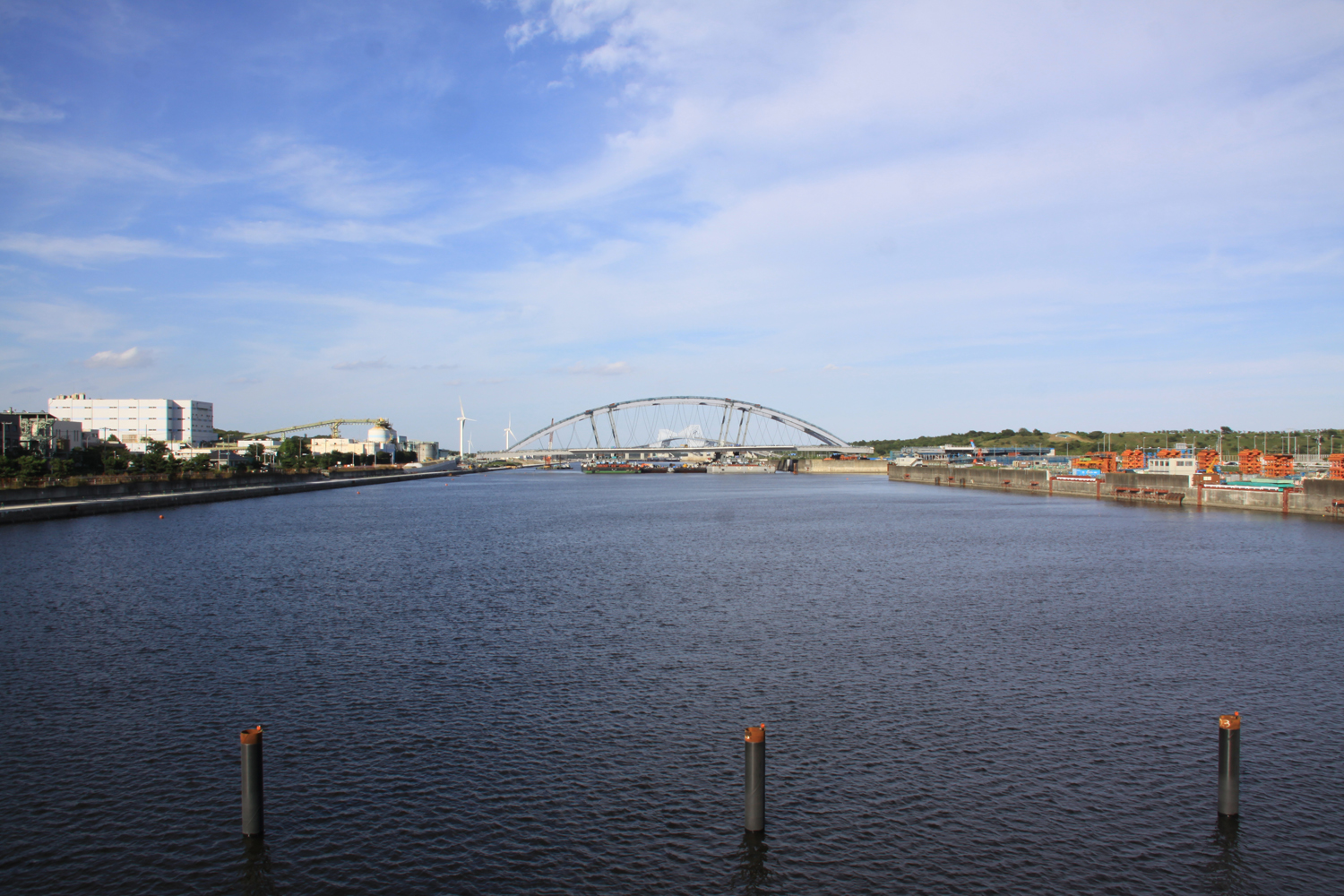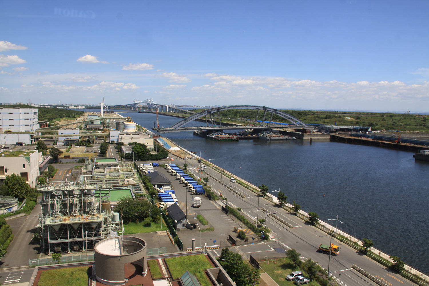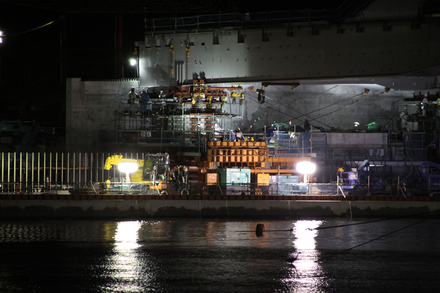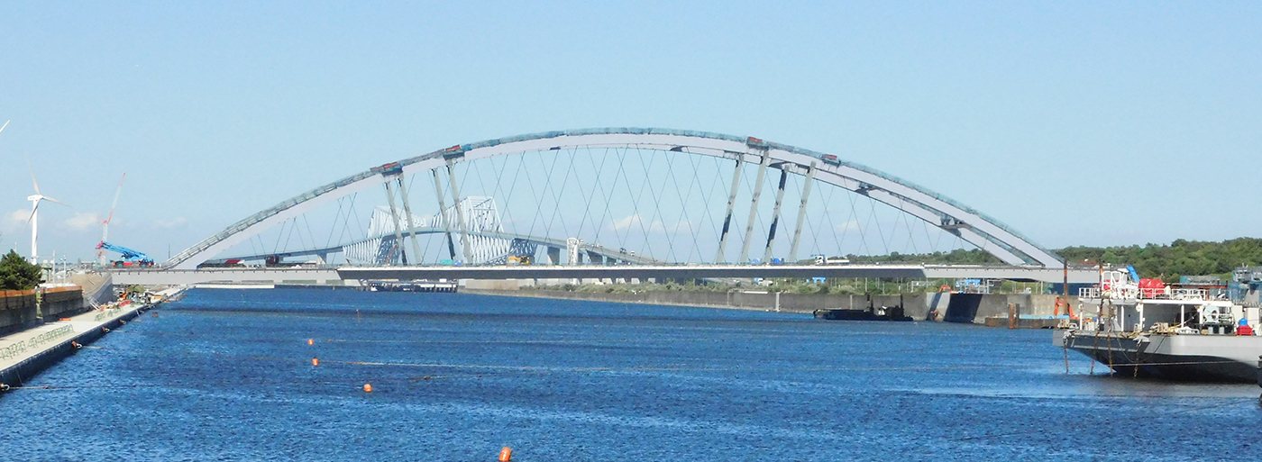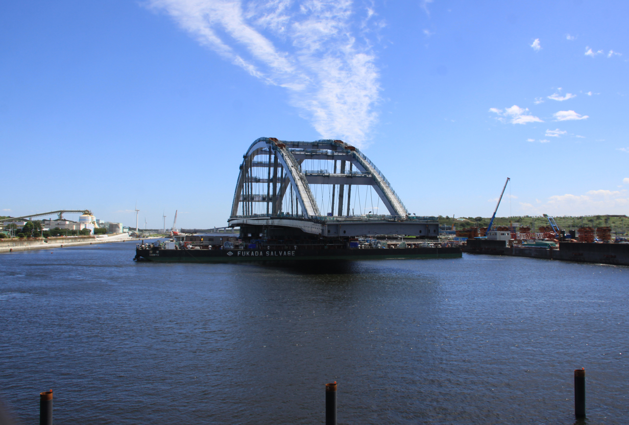 東京都港湾局は、17日から20日にかけて、2台の大型台船を用いた東西水路横断橋(仮称)の桁架設およびジャッキダウンを行った。架設地は、以前に中潮橋が供用されていた個所とほぼ同じ位置。東京都と国土交通省が建設を進めている臨港道路南北線および接続道路事業の一環で、その名の通り東西水路を跨ぐ橋梁。15日の段階で離岸していたが、17日に架設地近くまで400m航行した。当初同日に架設地の線形に合わせて桁を回転させる予定だったが、強風の影響で中止した。  18日午前中に桁を86度回転させて実際に架ける橋軸と同じ角度にした。さらに53mほど架設地点まで接近し、潮待ちして18時半ごろから微調整を開始、橋軸直角方向に8.5m、橋軸方向に4mほど動き、深夜12時半には荷重を台船からA1およびP1に移し替え、台船が退出した。縦断勾配はA1側に大きく、A1側2.7m、P1側0.8mを夜間に少しずつ下げていった(ジャッキストロークは150mm)。
