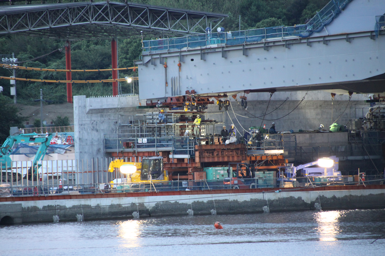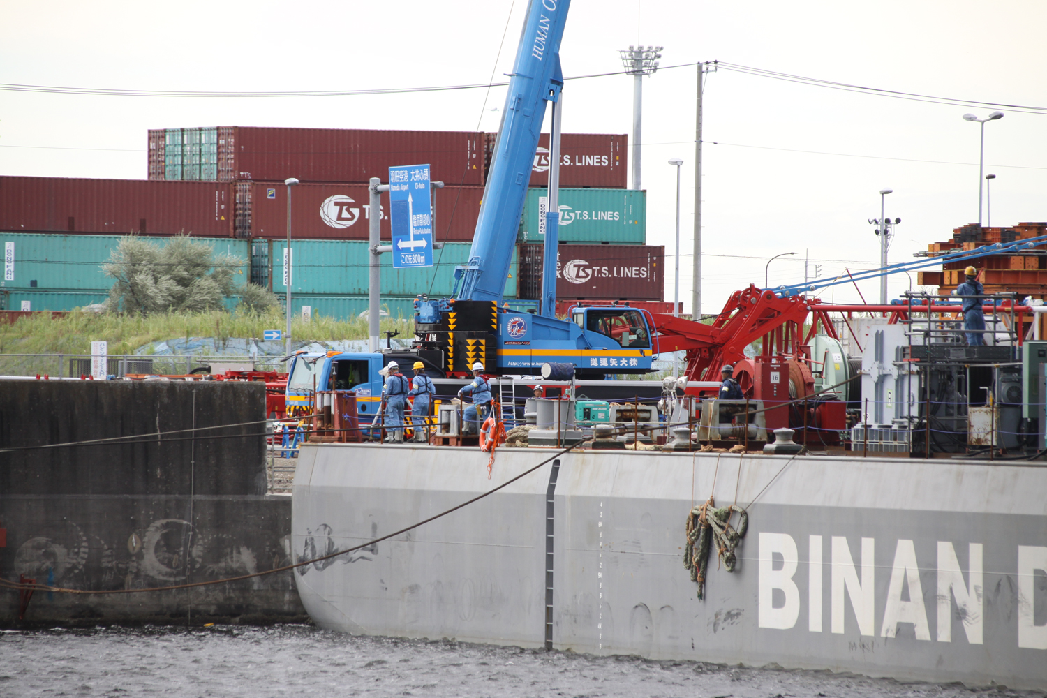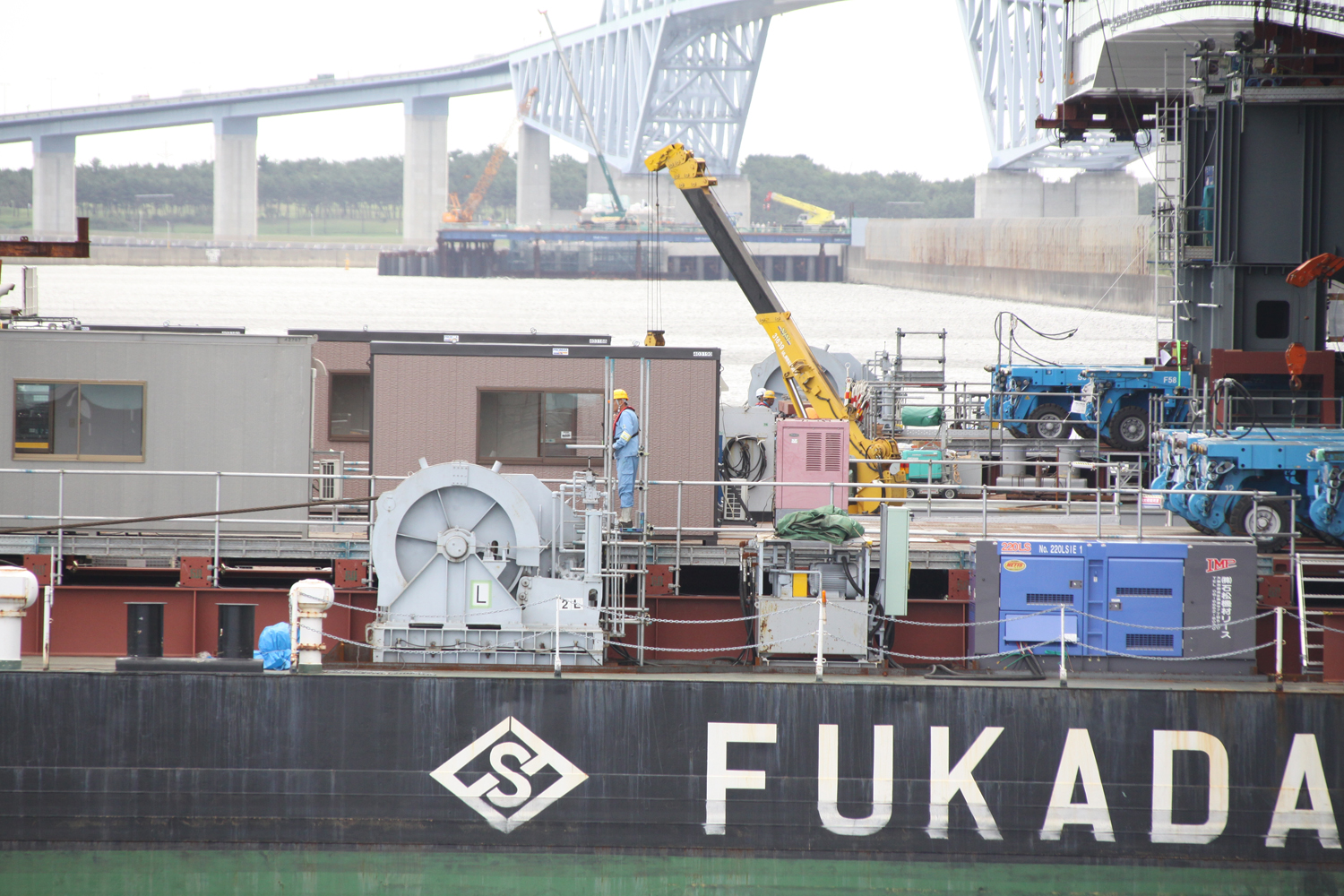 潮待ちする桁(中防大橋より)18日夕方ごろ