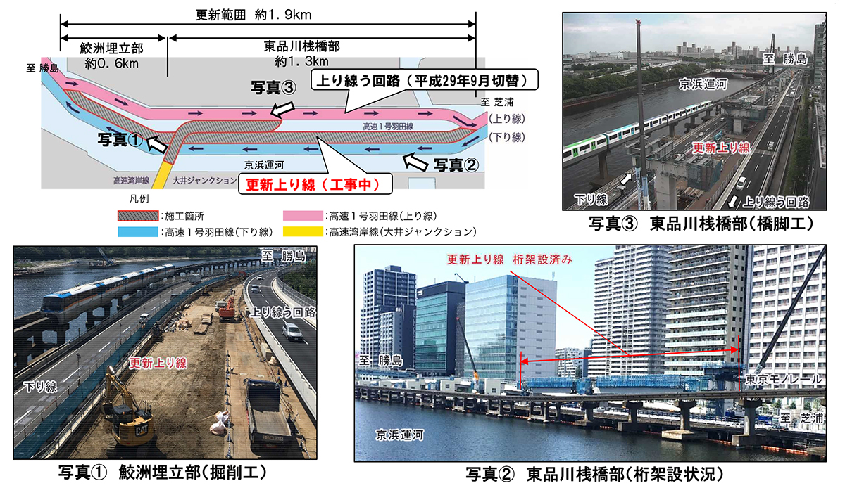 高速1号羽田線の東品川桟橋・鮫洲埋立部更新工事では、東品川桟橋部は更新上り線の橋脚工とともに7月から桁架設工を開始した。鮫洲埋立部は更新上り線の掘削工を行っている。現在、大井JCTの通行止めとなっている部分は来年9月に施行完了予定で、東京オリンピック時には湾岸線から羽田線への接続を可能にする。