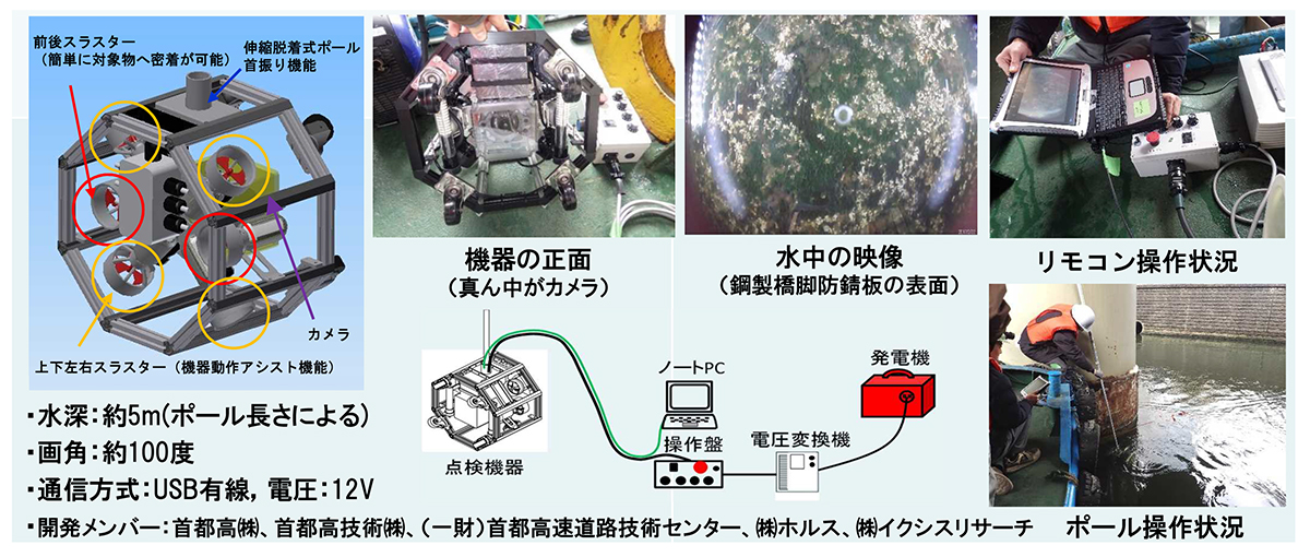 新開発技術として、「橋脚水中部調査機器」が紹介された。河川や運河内の橋脚水中部の点検は潜水士が行っているが、視界不良や水流の影響などがあったため、首都高速道路技術センター技術研究所が主体となって、水中撮影機器を共同開発した。機器上部に取り付けたポールとリモコン装置で水中に沈めた機器を操作して、水中部の撮影を行う。水深5mまでの調査が可能で、LEDライトやスラスター(スクリュー)を装備しているので、視界不良や水流の影響にも対応できるようになっている。