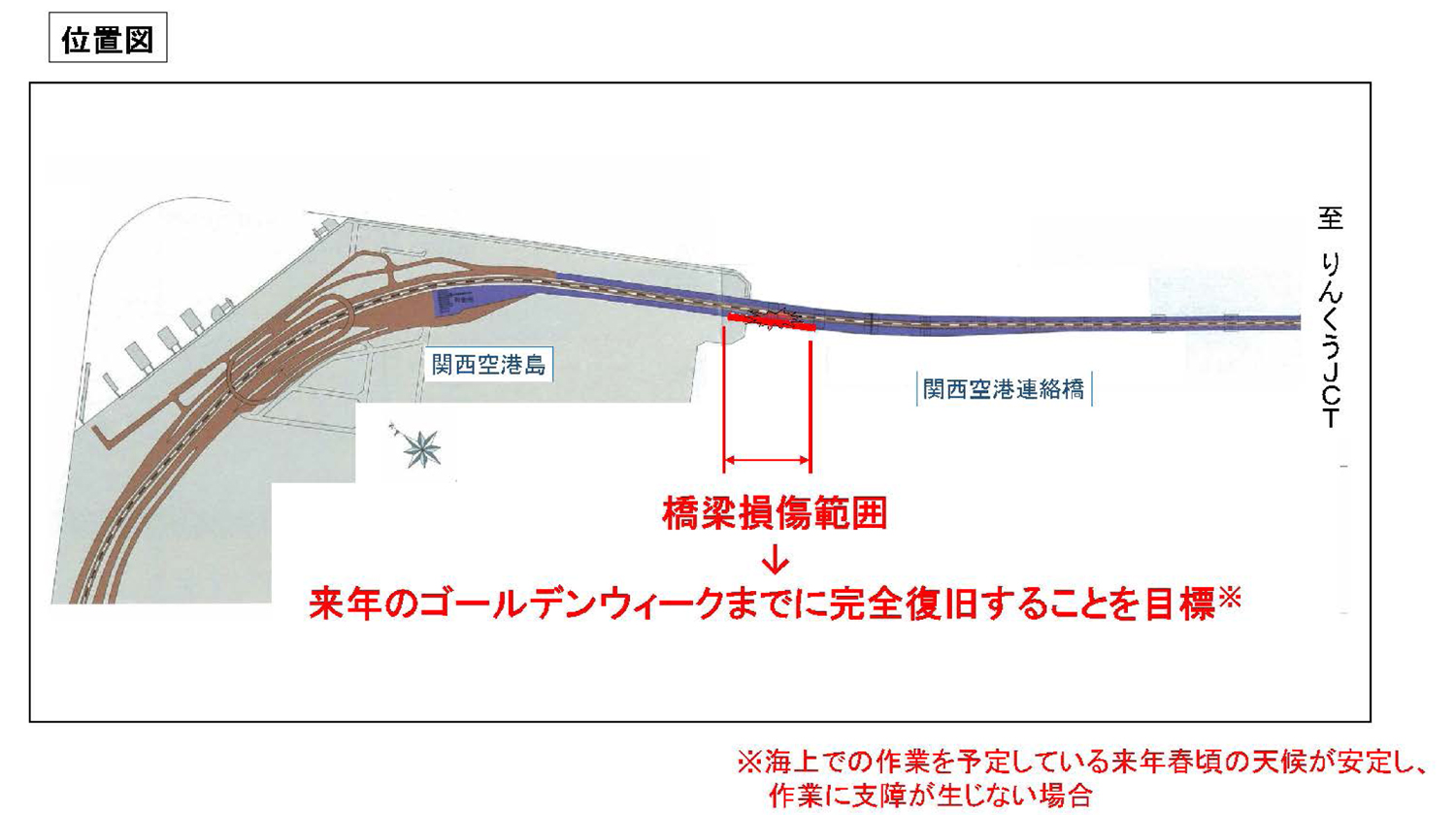 西日本高速道路は18日、関西国際空港連絡橋道路部について、2019年ゴールデンウィーク前の完全復旧を目指す、と発表した。撤去した桁が著しい損傷を受けたことから、一部を除き新桁を製作せねばならず、その方針に沿い、復旧時期を定めた。