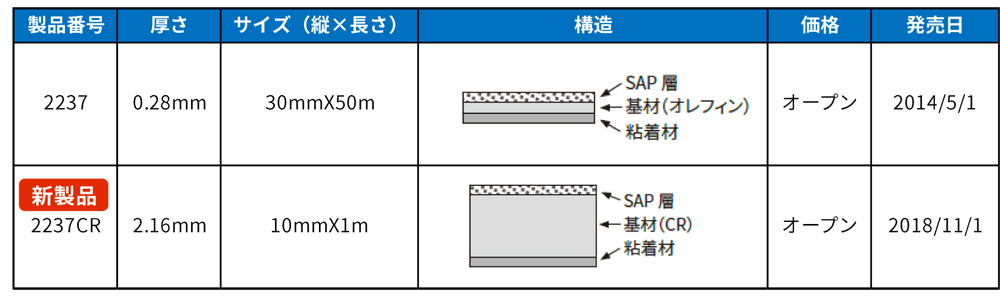 同テープは基材におむつなどに使われる高分子吸収体を使用しており、壁高欄や橋脚などの生コン打設において充填前に型枠の接続部分に貼るもの。打設時に高分子吸収体が水分を吸収して約400倍に膨らむことで型枠間の隙間を埋めてコンクリートの漏れを防ぐことができる。施工性の簡易さや美観向上が期待できることから実績は増えていたが、従来品は3mm以下の隙間にしか貼ることができなかったため改善が望まれていた。 NETIS登録番号はTH-140011-VE。