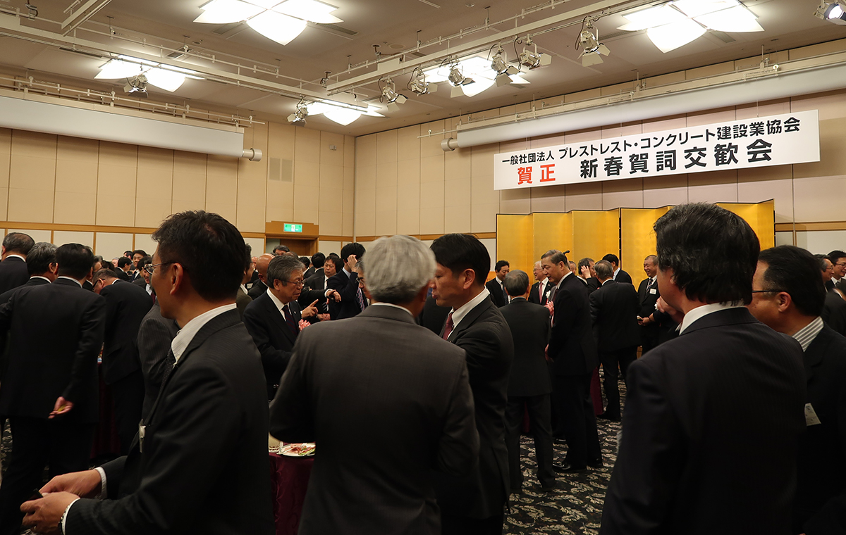 プレストレスト・コンクリート建設業協会(PC建協)は1月16日、東京・都市センターホテルで新年賀詞交歓会を開催した。それに先立ち、会長及び執行部が出席した新年記者会見を開催した。藤井敏道会長(右肩写真)は記者会見の中で「持続的な担い手確保を図るため2022年4月に会員企業全体の完全週休2日制(4週8休)の実施を図る」と表明した。その上で、「既に平成30年度上半期には、第一のステップである4週6休を全事業所514現場のうち80%で実施しており、22年4月の完全実施は可能だ」とした。週休2日実施の課題として「調査対象とした片持ち架設23現場のうち75%で工期が不足している。工事価格も経費補正係数なしの場合に対して工事価格が5%程度不足している」と具体的な数を上げて、「適切な工期の設定や処遇改善のための原資および工事利益の確保を発注者へ要望していく方針」とした。