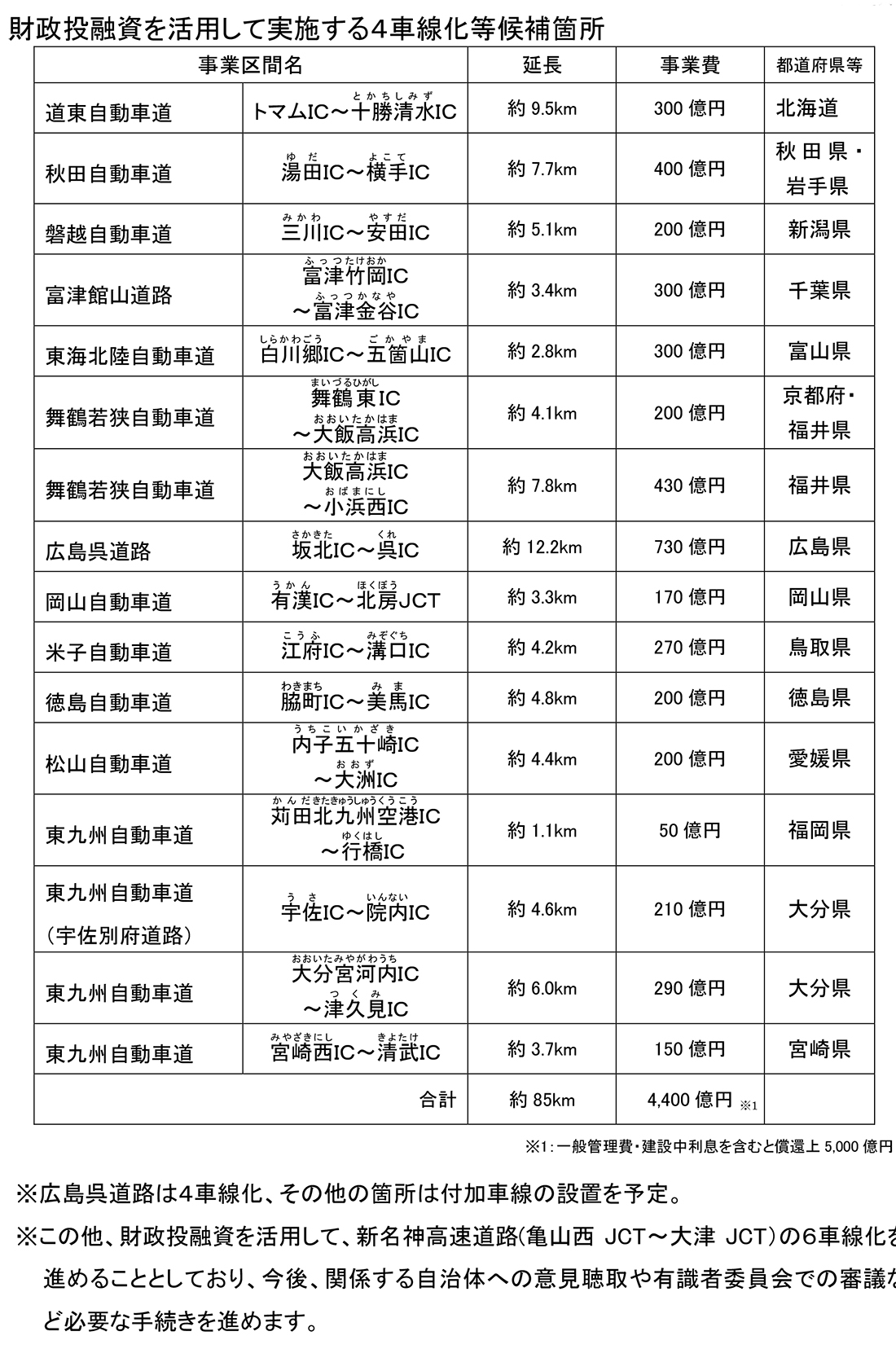 国土交通省 暫定2車線区間の4車線化等候補箇所を発表