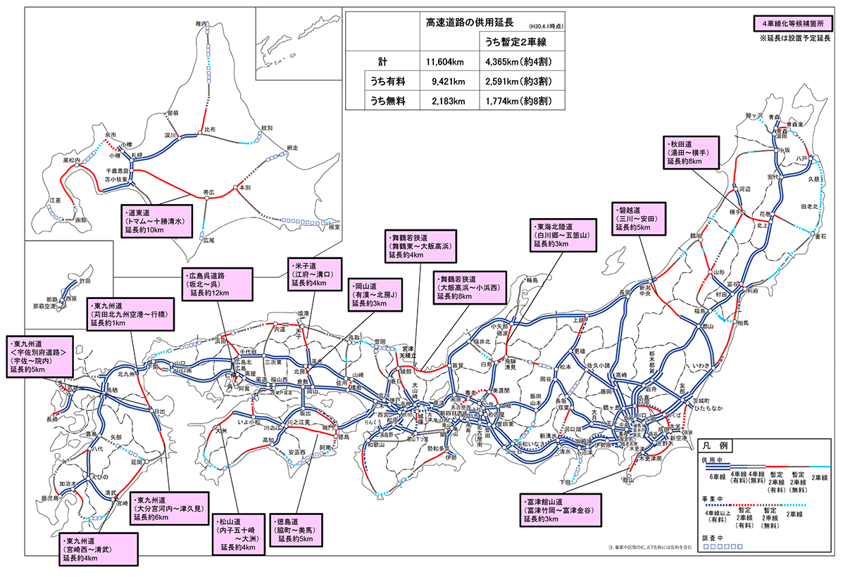 国土交通省は8日、高速道路の暫定2車線区間の4車線化等候補箇所を発表した。同省は暫定2車線区間について、「防災・減災、国土強靭化のための3か年緊急対策」の一環として、平成31年度から財政投融資を活用して4車線化等を実施することにしている。