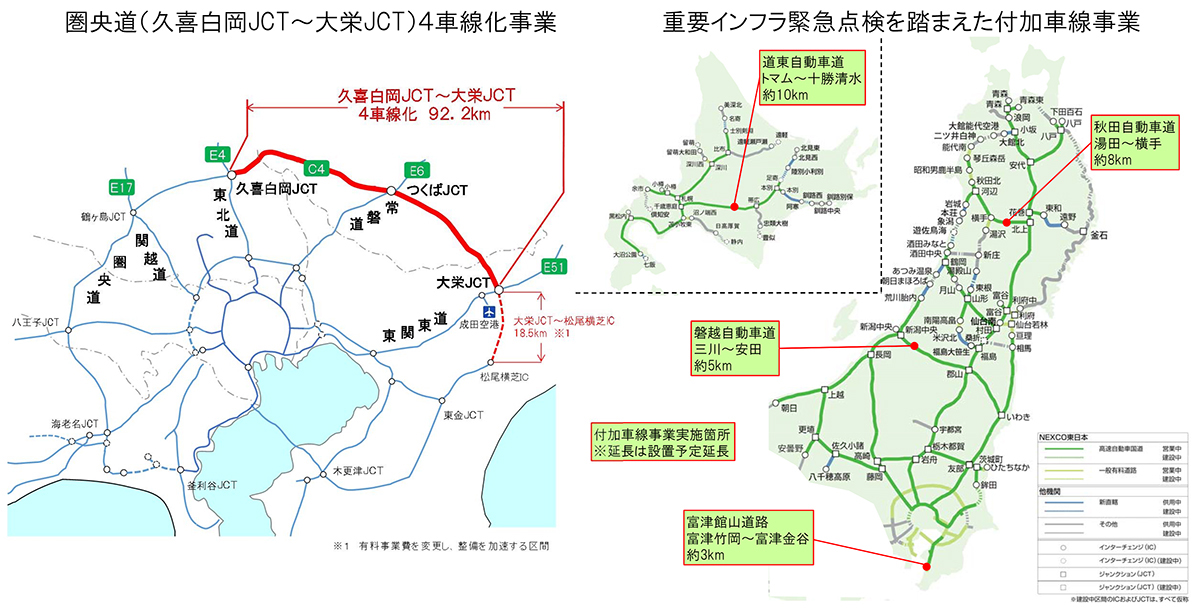 付加車線事業は、道東道のトマム~十勝清水間約約10km、秋田道の湯田~横手間約8km、磐越道の三川~安田間約5km、富津館山道の富津竹岡~富津金谷間約3kmで進める。