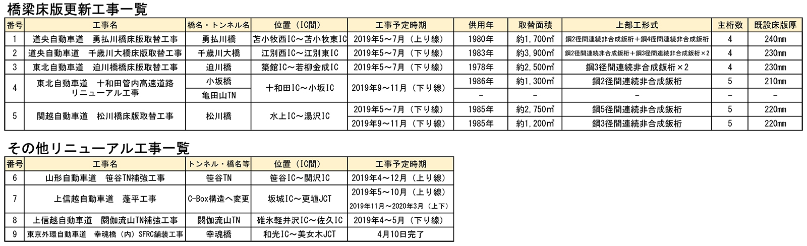 2019年度高速道路リニューアルプロジェクト一覧(NEXCO東日本提供資料より作成)