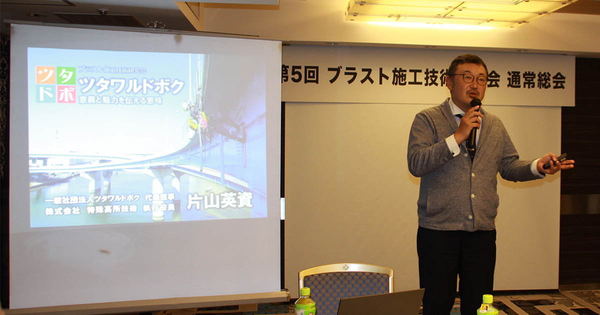 その後の講演会では、ツタワルドボク代表理事(特殊高所技術執行役員)の片山英資氏が「ツタワルドボク」の活動の内容について、熱く語った。地震の長崎水害(1982年7月)で住んでいた家が水害で大きく被災したことから土木を志したと述べ、民間コンサルタントや福北高速在籍時の事例、さらに民間と公的機関で感じていた市民と土木の相互無関心状態を解消するべく始めた、市民と土木と市民を繋ぐ「ツタワルドボク」の内容を語った。ツタワルドボク学会などのイベントや議論する場を作ることで、市民と土木技術者の間の専門的な垣根をなくし、語り合うことが土木の市民的価値を高め、人材を獲得することにつながる、と柔らかい例を挙げながら論じた。