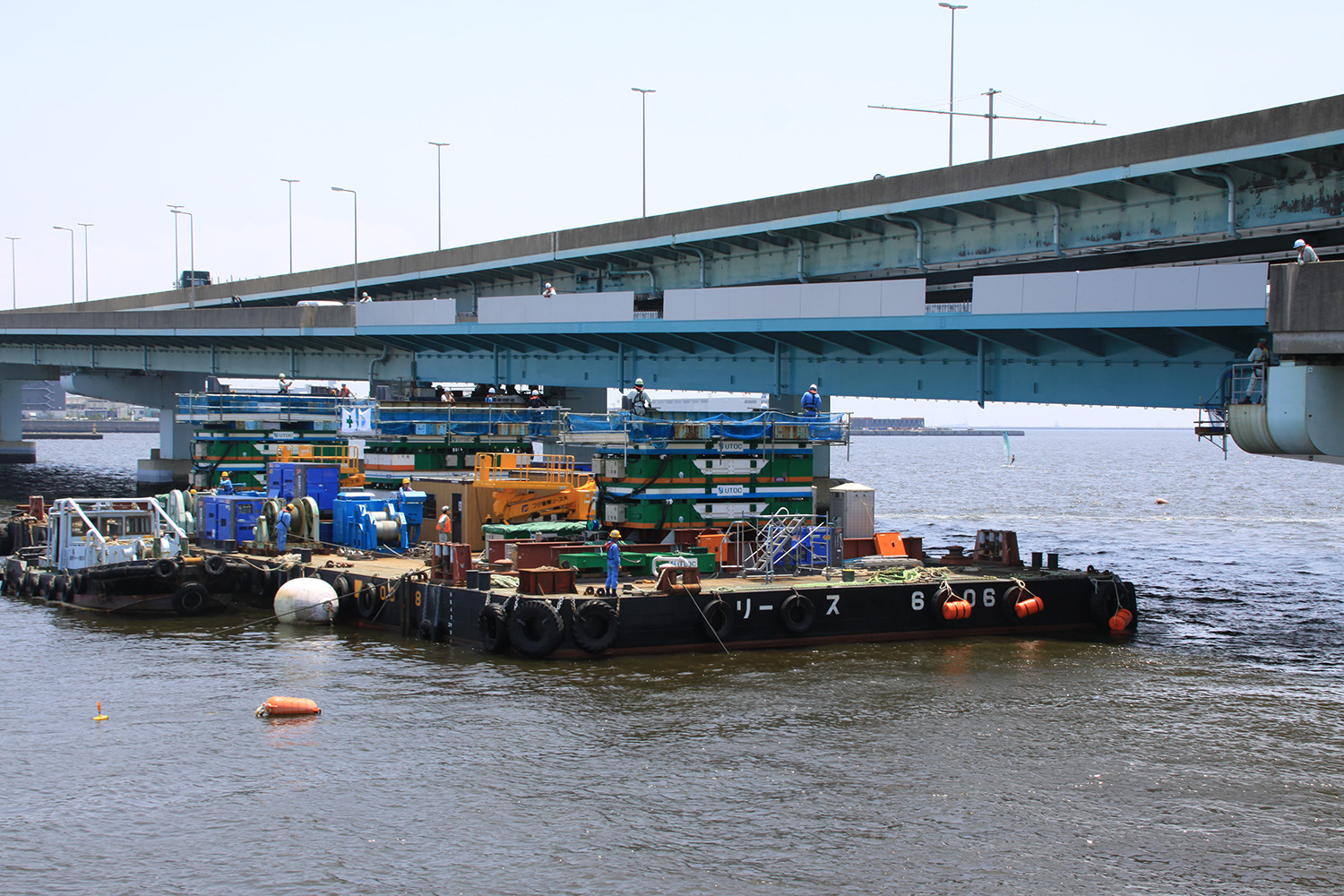 同橋は、甲子園浜~鳴尾浜を結ぶ海上部に架かる橋梁で、阪神高速5号線と並行する個所にあり、阪高と同一の橋脚上に供用されているもの。5日の撤去時と同様に2,500t積みの台船上に上下2段積みのテーブルリフト(一基当たりのせり上げ荷重は250t)を3点に配置し、その上に新桁を載せ、昇降操作して架設した。架設は7時過ぎから始まり4.1mジャッキアップして、両側の高欄を交わす位置まで桁を上げた後、8時ごろにP2-P3間に進入し、ジャッキダウンを始め、9時半ごろには50mmを残して潮待ち(潮位の低下)した。その後11時半~12時に残る50mmのストロークを下げて桁を両橋脚に預け、タッチアップを施した後に、潮位が最も低下する12時半ごろに台船を桁下から撤去させた。