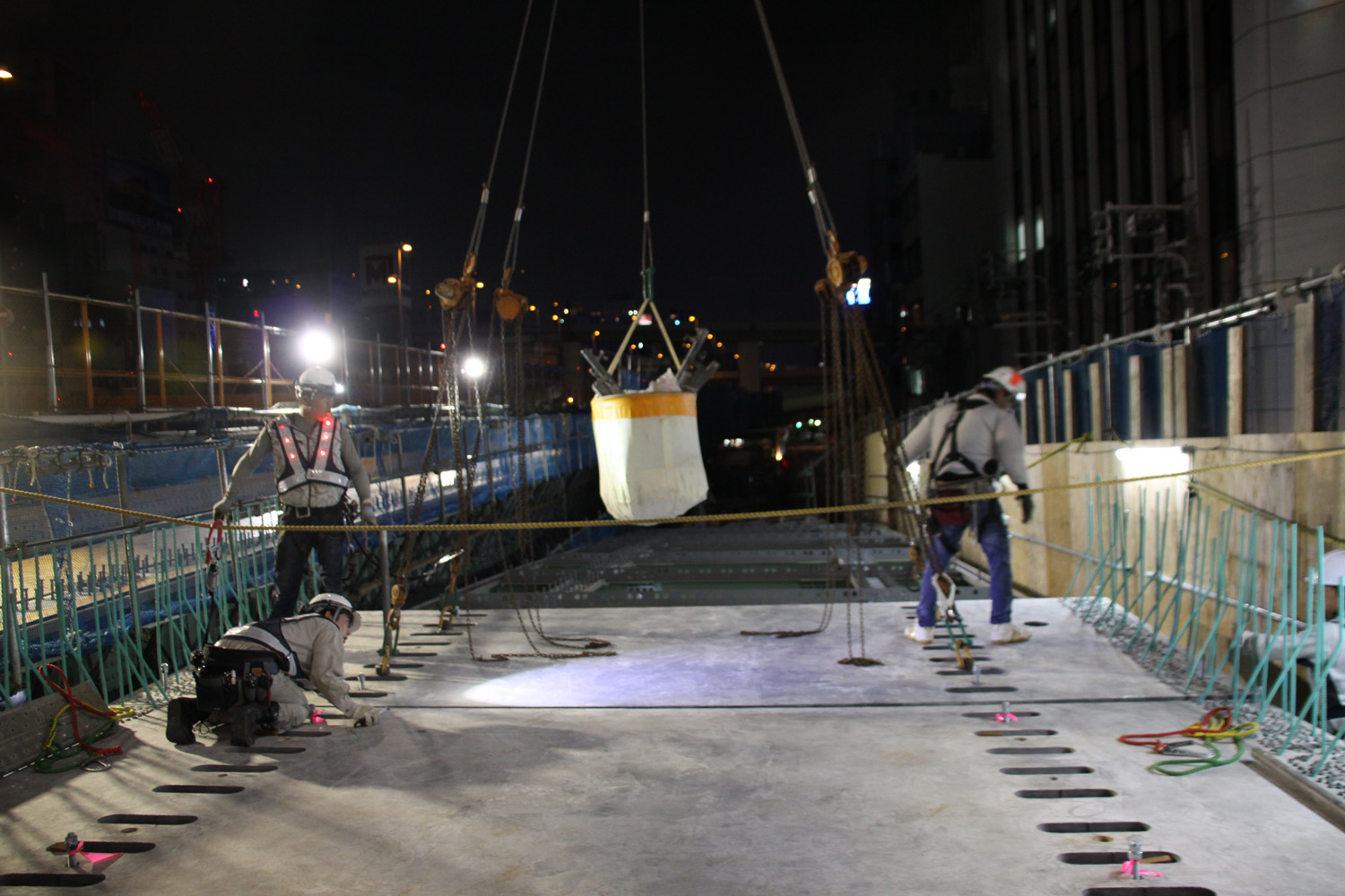 阪神高速道路は、17日22時~18日未明にかけて、信濃橋入口のNP5~NP4間の本町通を跨ぐ橋長37mの単純合成鈑桁部において、道路橋では国内初となるワッフル型UFC床版の架設現場を報道陣に公開した。同床版は2方向にリブがあるワッフル形状のプレキャスト床版で、180N/mm2の強度を有する超高強度コンクリート床版でありながら、鋼床版並みに軽量化を図ることができるのが特徴だ。1枚当たり幅5.75m、長さ2.45m、厚さ150mm、重さ3.6tのUFC床版パネルを公開前日に6枚、公開日に9枚、合計15枚設置した。