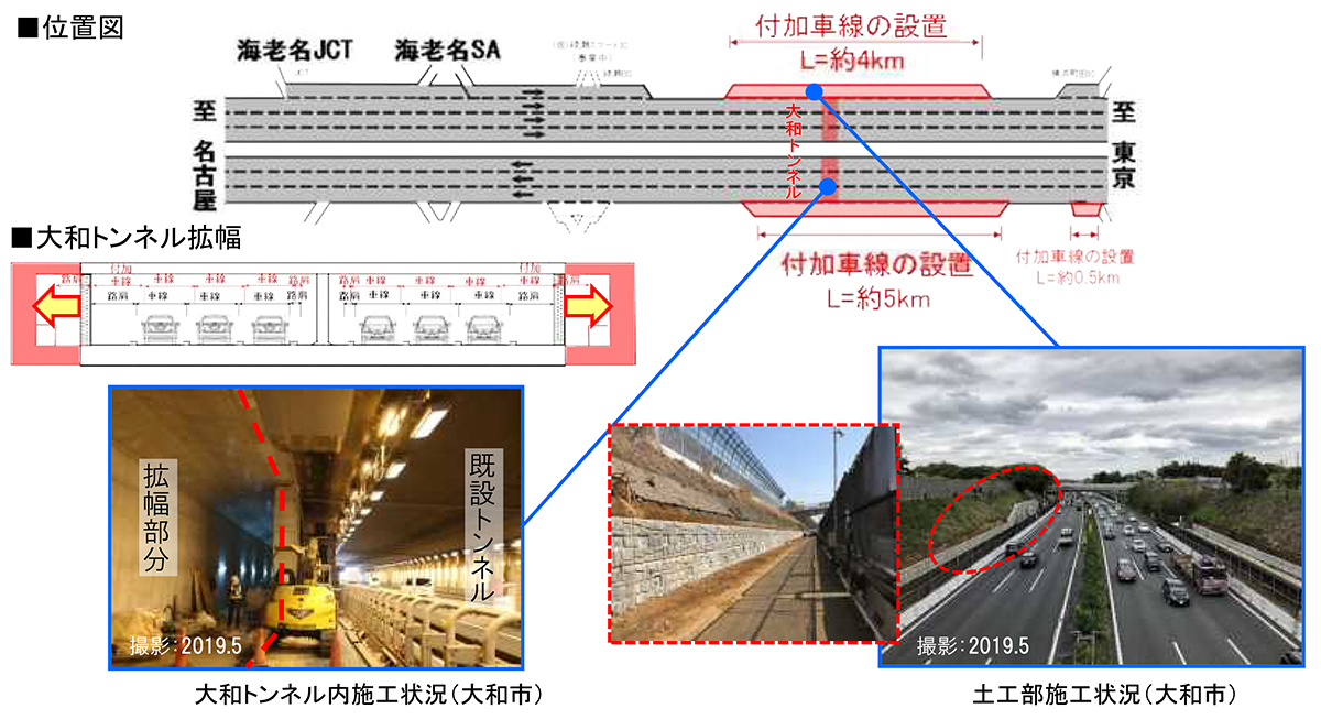 渋滞対策では東名高速の大和トンネル付近、中央道の小仏トンネルと相模湖IC付近の付加車線設置事業が行われている。大和トンネル付近では東京オリンピックまでの運用開始を目指して上下線で拡幅工事が進められており、小仏トンネル付近(上り線)では別線トンネル工事のための前工事に着手している。小仏トンネルおよび相模湖IC付近の本工事は来年度に発注予定。