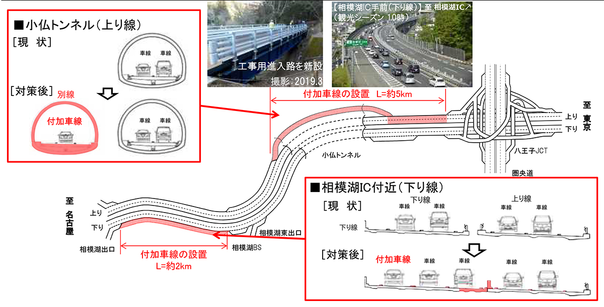 渋滞対策では東名高速の大和トンネル付近、中央道の小仏トンネルと相模湖IC付近の付加車線設置事業が行われている。大和トンネル付近では東京オリンピックまでの運用開始を目指して上下線で拡幅工事が進められており、小仏トンネル付近(上り線)では別線トンネル工事のための前工事に着手している。小仏トンネルおよび相模湖IC付近の本工事は来年度に発注予定。