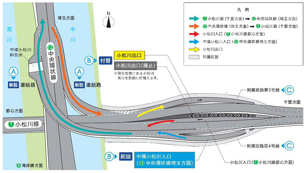 首都高速道路は7日、小松川JCTおよび渋谷線(下り)渋谷入口が2019年内に開通することを発表した。小松川JCTでは、中央環状線の埼玉方面と小松川線の千葉方面を結ぶ連絡路を新設。これにより、埼玉方面と千葉方面を結ぶルートの所要時間が短縮されるとともに、都心環状線、中央環状線、外環道によるトリプルネットワークからルート選択が可能になる。また、埼玉方面に向かう小松川入口も新設する。