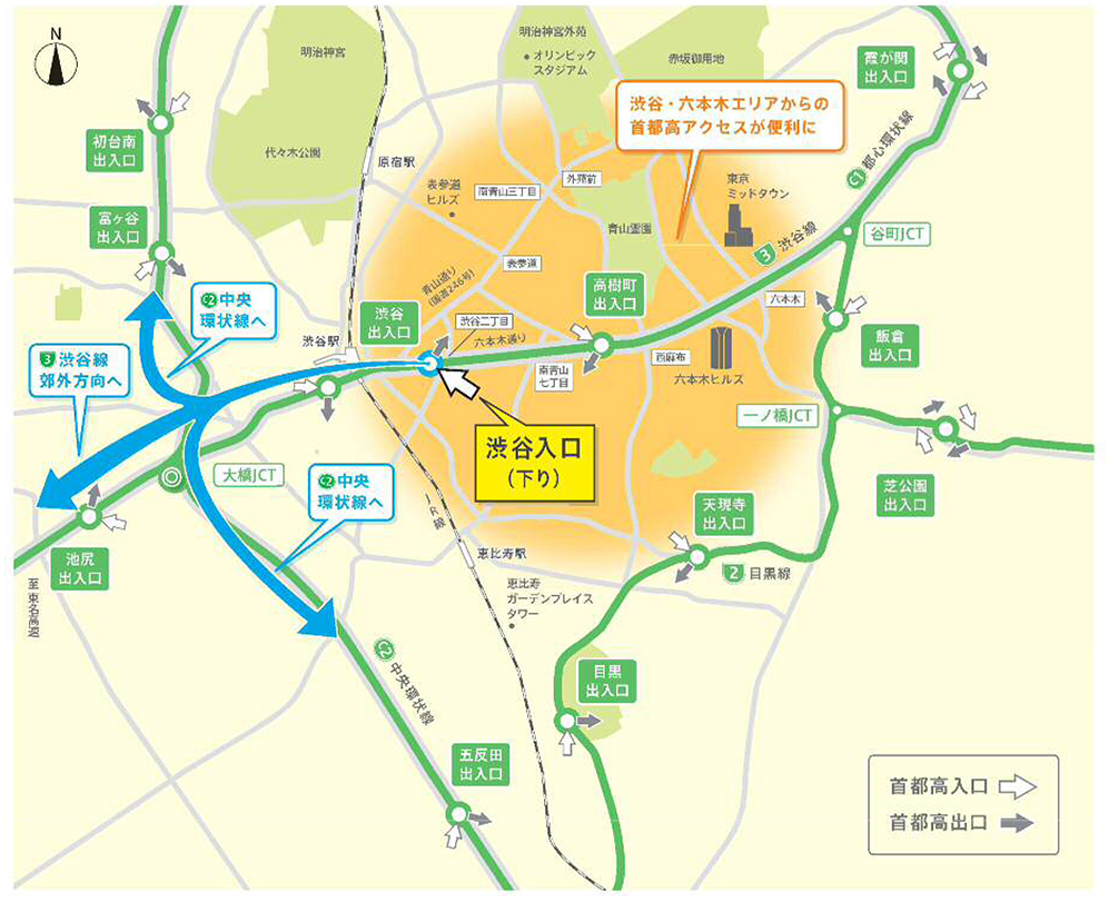 渋谷入口(下り)では、渋谷・六本木周辺から首都高へのアクセス性が向上するとともに、渋谷線(下り)から中央環状線に初めてアクセスが可能になる。渋谷駅周辺からは中央環状線と都心環状線のルート選択が可能になり、交通集中時の渋滞を回避することで所要時間の短縮にもつながる。