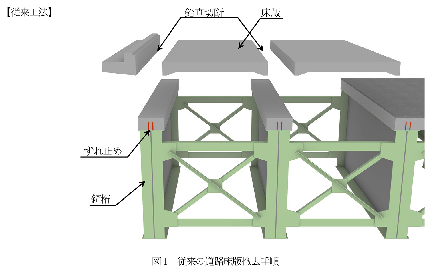 従来の橋桁と床版がスタッドなどのずれ止めで接合されている合成桁における床版撤去工事の施工ステップは、①桁の両側の床版をコンクリートカッターで鉛直に切断して撤去、②桁上に残った床版コンクリートをブレーカやWJなどで撤去し、③最後に設置されたずれ止めを切断するーというものだった。