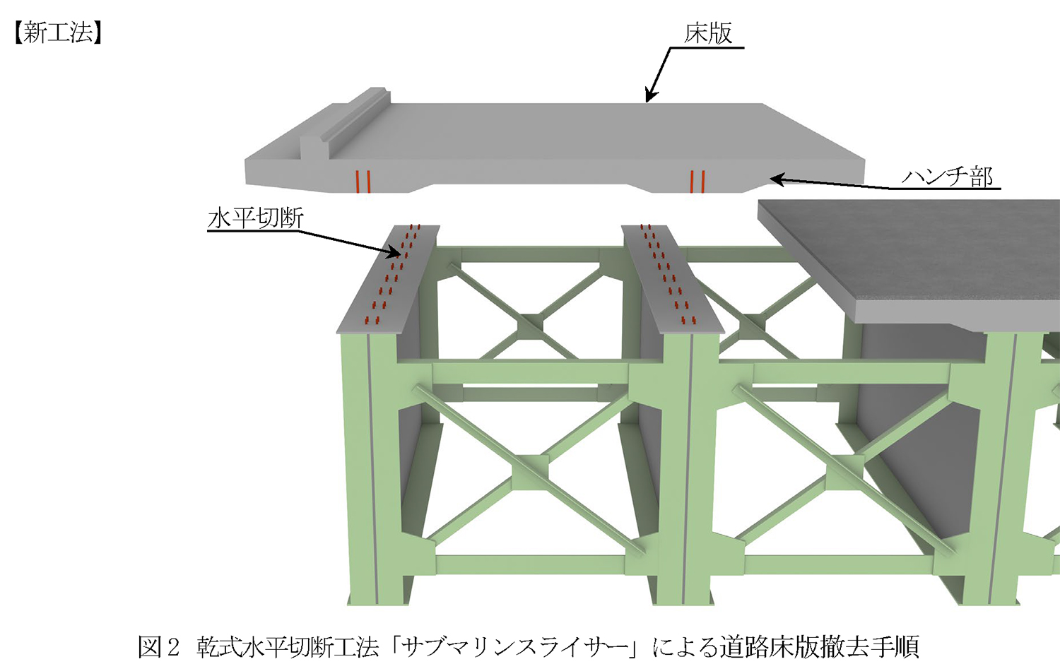同工法は、乾式水平切断装置を床版の下に取り付けて、ハンチ部をずれ止めと共に切断し、桁と床版を切り離すことができるため従来の施工ステップを大幅に削減できる。具体的には、例えば4主鈑桁でG2桁上のハンチを水平切断したい場合、ワイヤーソーを支える治具をG1-G2間とG2-G3間に置き、事前にG2のハンチの2か所をコアドリルで削孔し、そこにダイヤモンドワイヤーを挿入してつなげ、足場や桁などに備え付けたレールなどでプーリーを備えた治具を橋軸方向に動かしていき、切断していく。これで床版と桁の接合部を切り離した後にクレーンの能力に応じて小割にし、撤去することができる。切断面が上フランジの上面から非常に低くなり、上フランジ上面のスタッドの研掃や残されたコンクリートの処分も最小限に抑制することが可能だ。