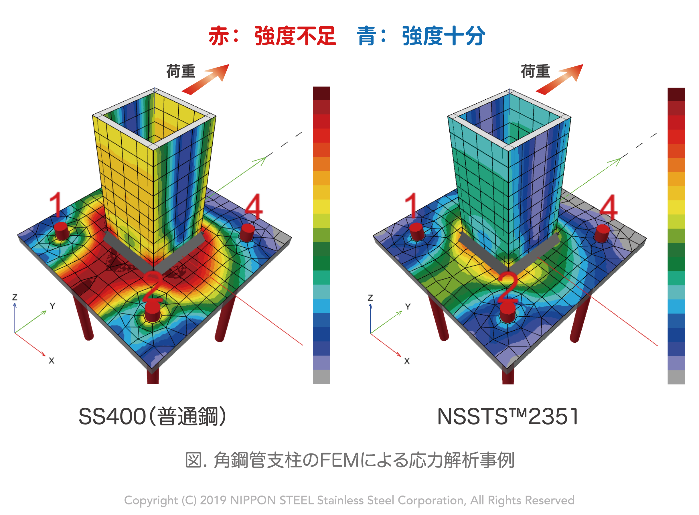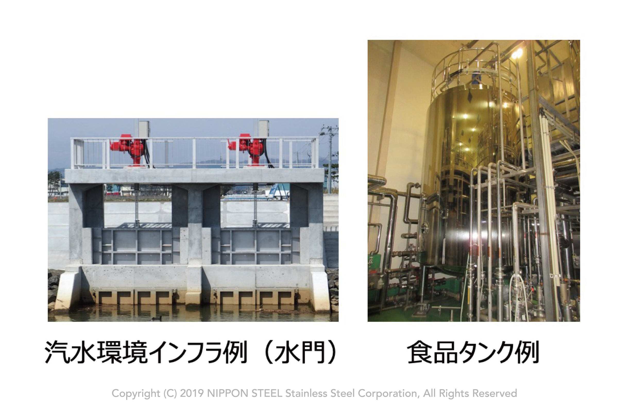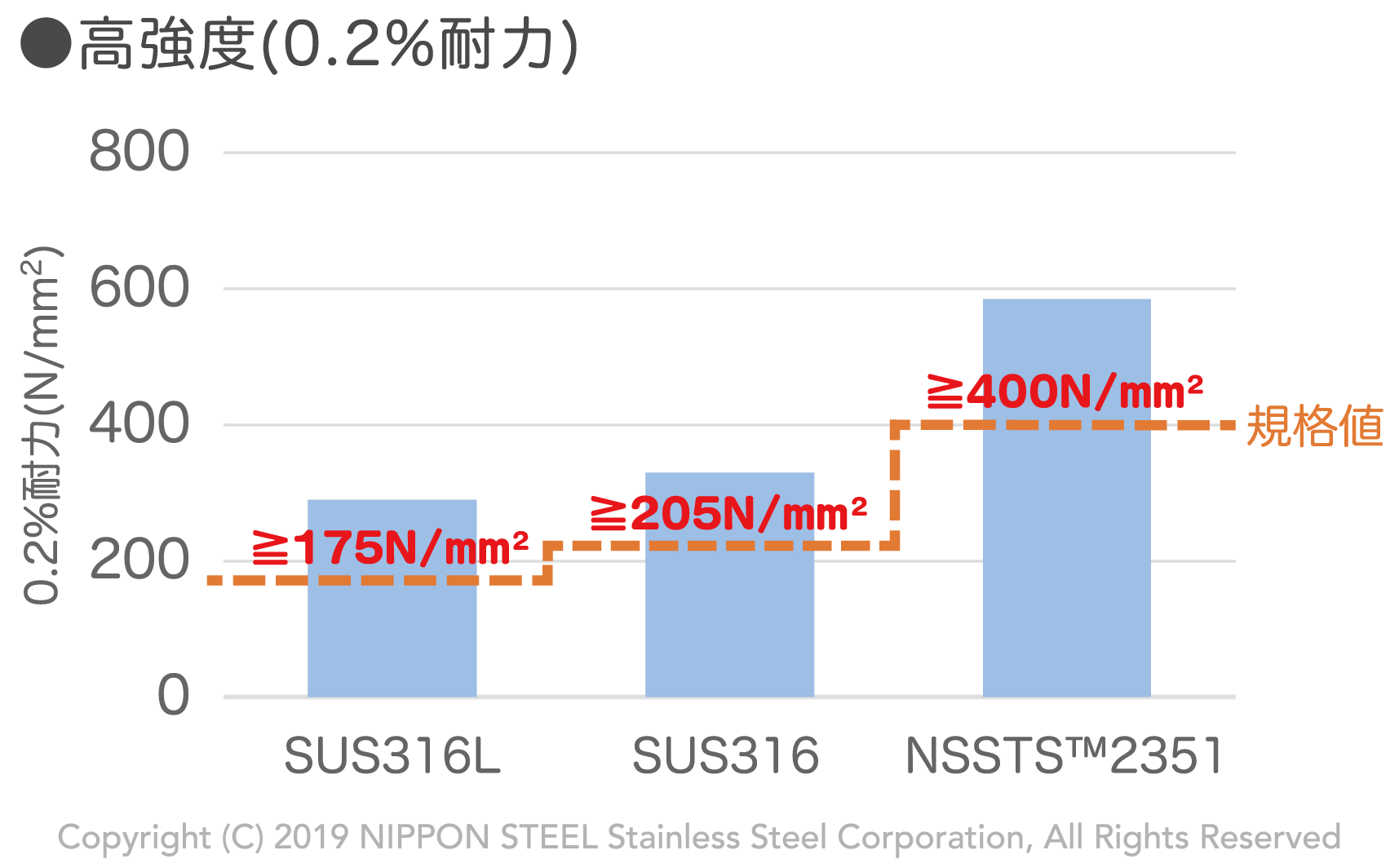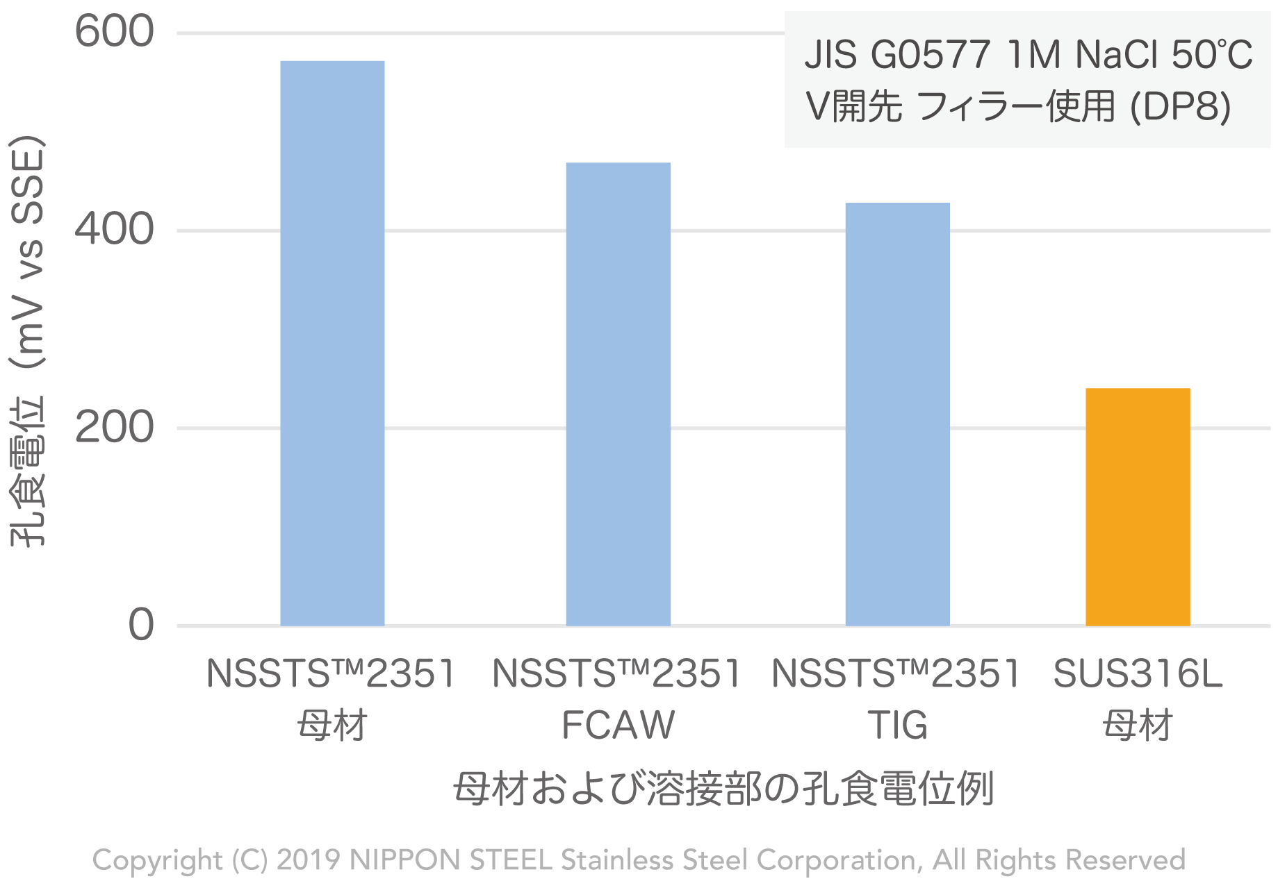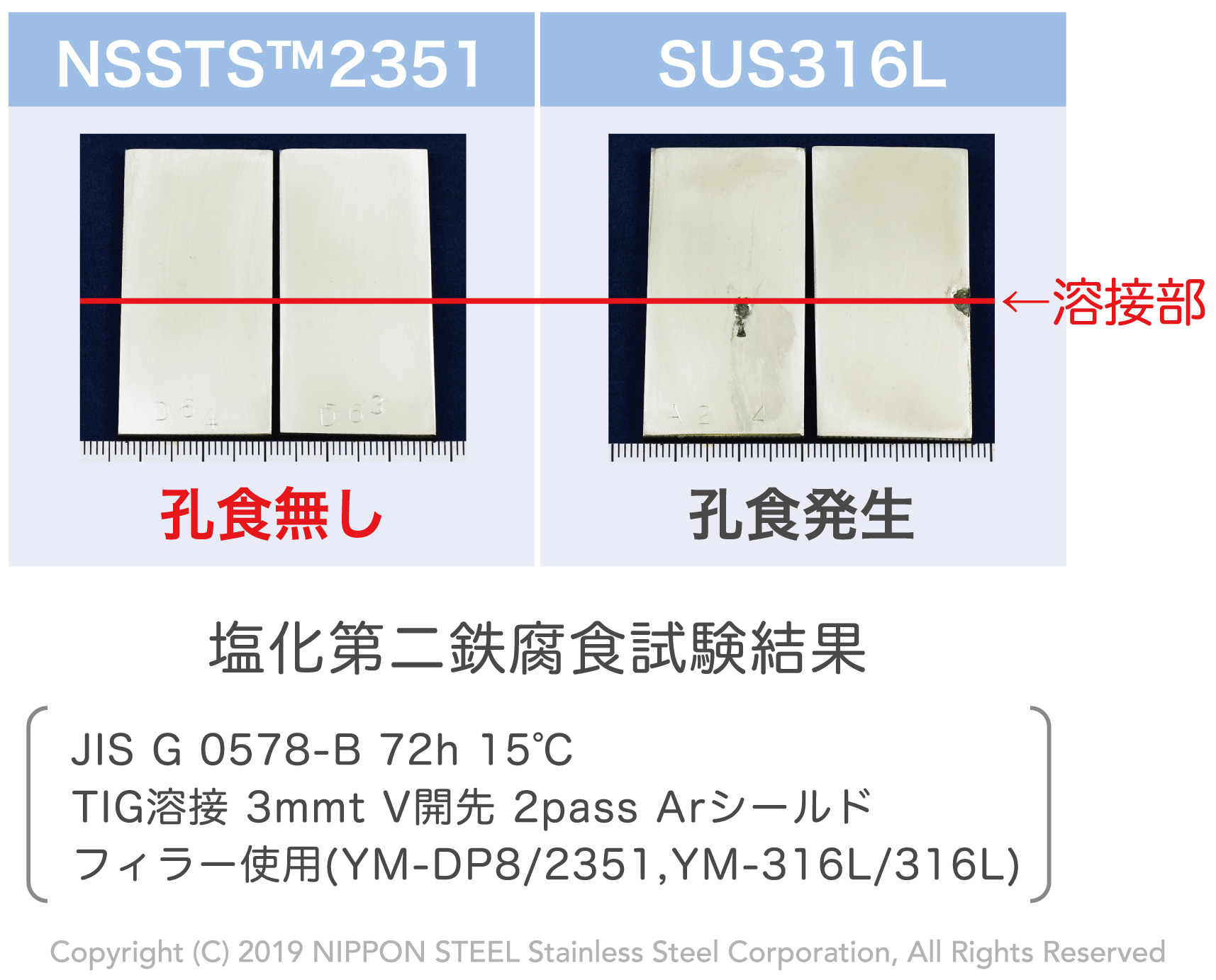 同様に強度は約2倍程度(205N/mm2→400N/mm2)、溶接性も独自開発したマイクロアロイング技術(ごく微量のニオブ(元素記号Nb)を添加し、それに合わせて鋼材製造技術を適正化する技術)を活用することで、大入熱・繰り返し溶接を行っても窒化物の析出が起きにくく、溶接部の耐食性の低下を大きく抑制している。