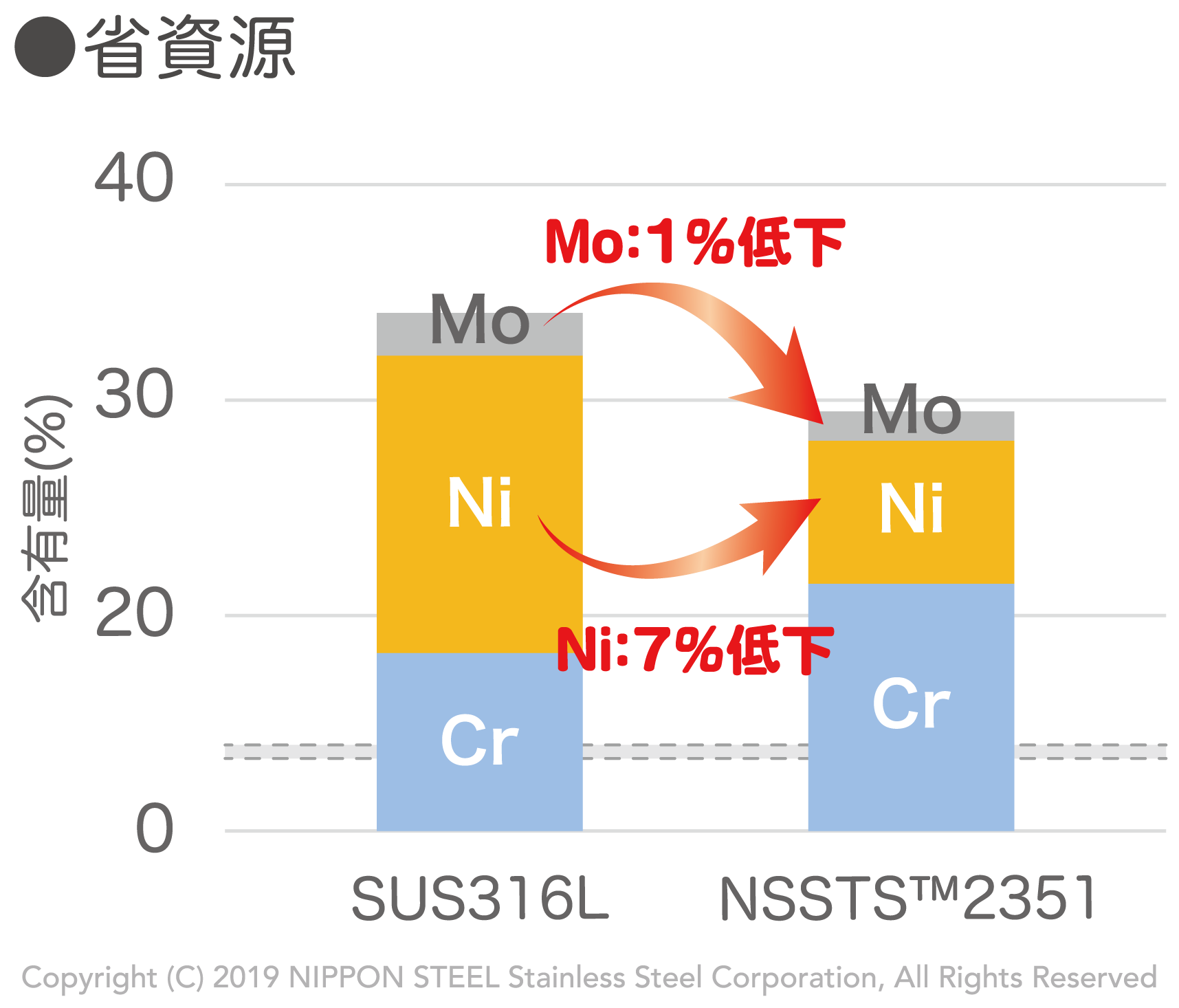 コストはSUS316・316Lと比較してレアメタルの含有量(ニッケルを58%、モリブデンを50%削減)を大きく削減していることや強度向上による薄肉軽量化が図れることから製品単体だけでも1割程度安くできる。また、設計・施工・輸送のコストも(軽量化・薄肉化により)削減できる。