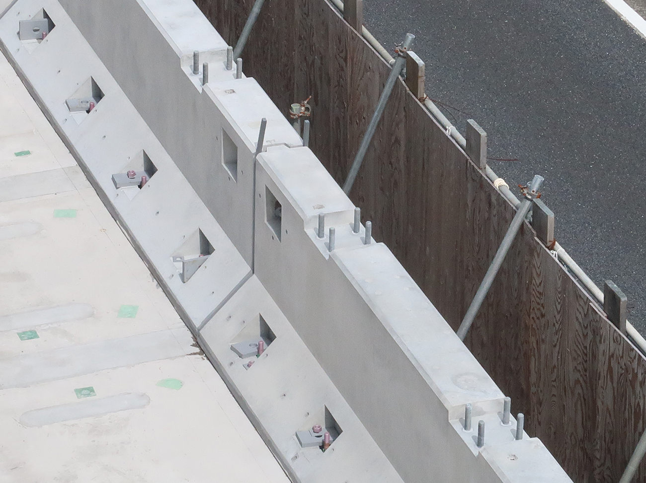 現在は、更新上り線(更新Ⅰ期線)の工事が進められていて、2018年7月から開始された桁架設は本年7月に完了。プレキャストPC床版の架設も完了し、場所打ち床版の施工を進めている。ここでは床版だけでなく、壁高欄も工程短縮のために、プレキャスト壁高欄(EMC壁高欄)を採用している。壁高欄設置後は、防水工と舗装、付属物設置を進めていく。