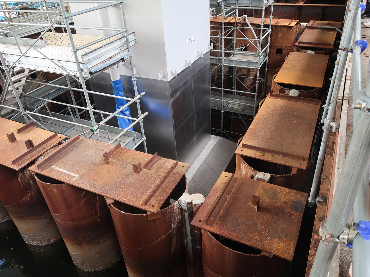 ステンレスライニングを橋脚基部の表面に溶接/恒久足場を設置