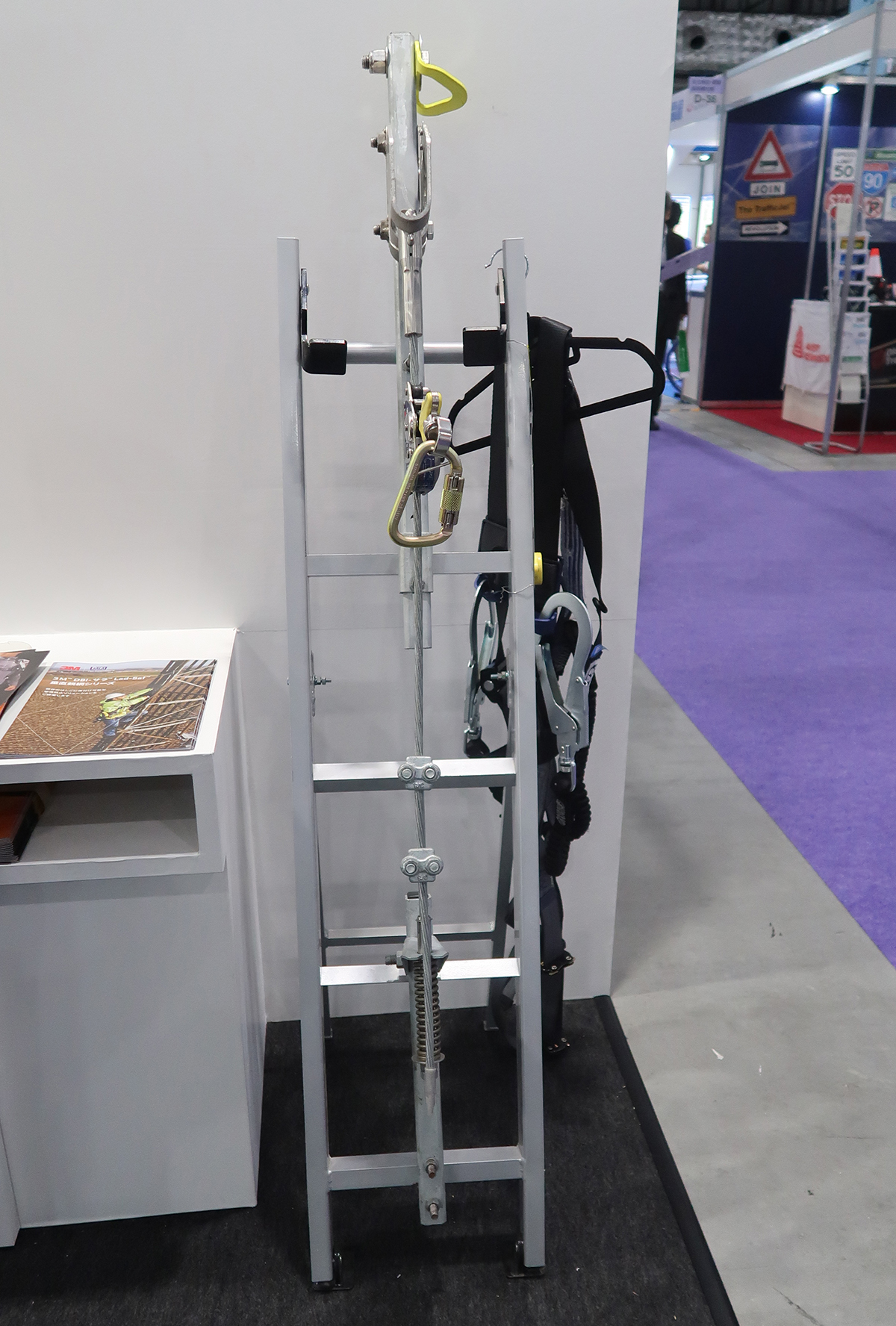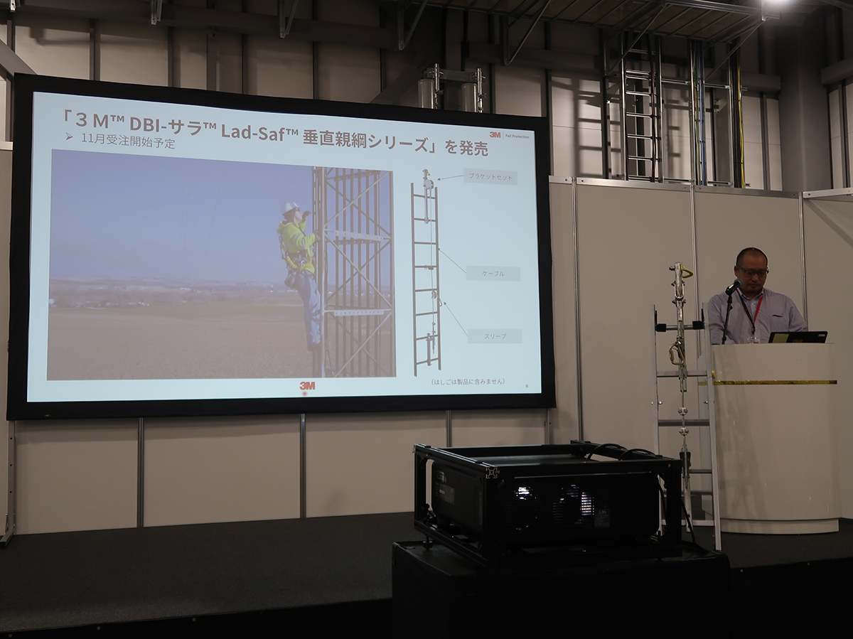 プレゼンテーションコーナーでは、出展者による展示品紹介が行われ、スリーエム ジャパンは既存のはしごに後付け可能な墜落防止ソリューション「3M DBI-サラ Lad-Saf垂直親綱シリーズ」の紹介を行った。11月から受注開始予定の同シリーズは、はしごに取り付けるブラケットとケーブル、スリーブからなり、安全でスムーズな昇降を実現する。