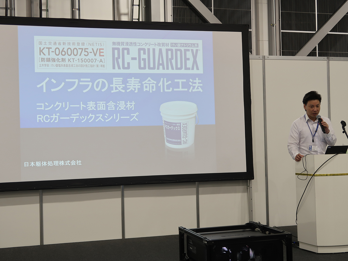 けい酸塩系コンクリート改質材「RCガーデックス」シリーズを展開している日本躯体処理は、「RCガーデックス土木用(1回塗り)」の特徴を説明。従来製品では、散水→材料塗布→養生の3工程を2回施工する必要があったが、同製品では材料塗布の1工程のみで要求性能を発揮するので、工程数を80%削減できる。