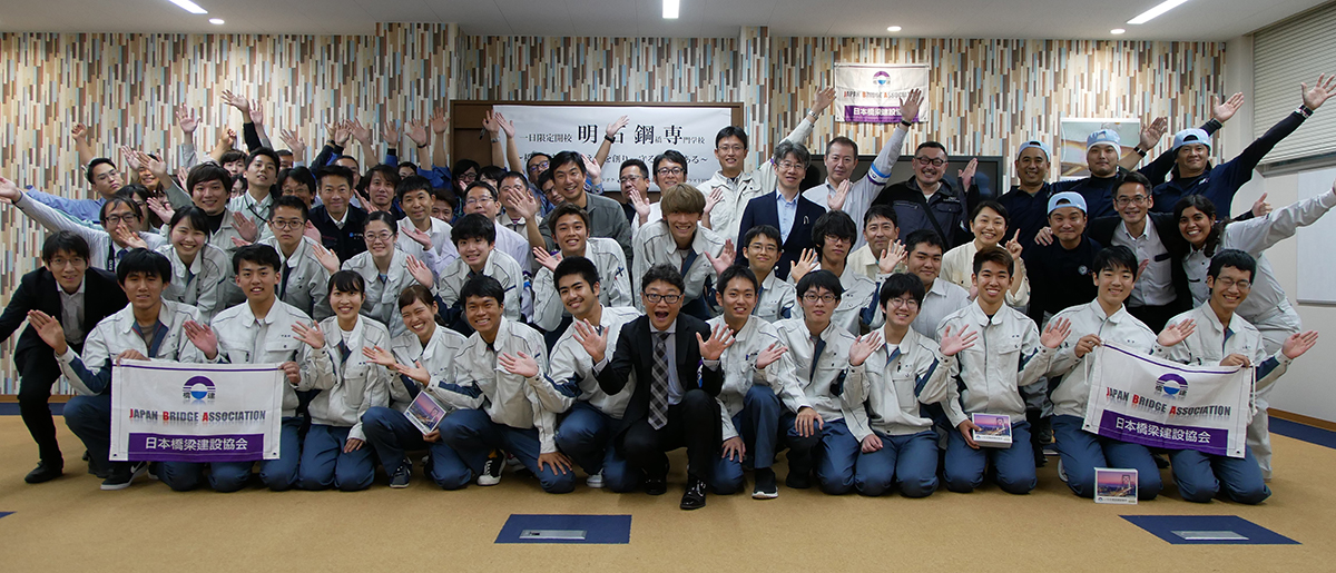 日本橋梁建設協会(略称・橋建協、会長=満岡次郎・IHI社長)、日本鋼構造物循環式ブラスト技術協会(会長=山田博文・ヤマダインフラテクノス社長)、ツタワルドボク(会長=片山英資・特殊高所技術執行役員)の3団体と明石工業高等専門学校は10月26日、同校で「一日限定開校 明石鋼橋専門学校」を開催し、学生21人が受講した。