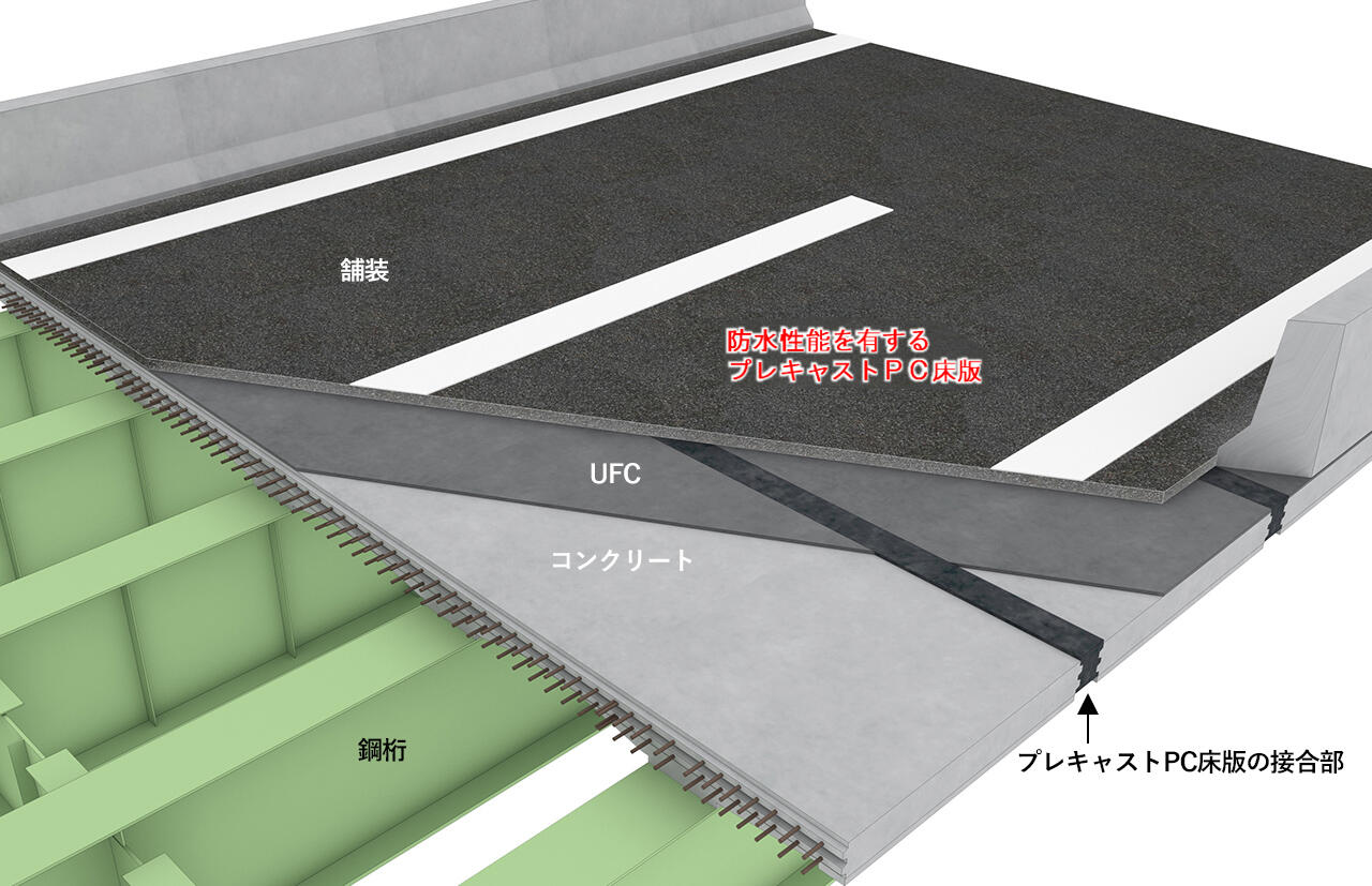東日本高速道路と大林組は共同で、超高強度繊維補強コンクリート(UFC、150N/㎟以上)を用いた防水性能を有するプレキャストPC床版を開発した。緻密かつ遮水性能に優れるUFCをプレキャストPC床版上面に接着する構造とすることで、床版内部への雨水の浸透を防止したことが特徴だ。間詰部も同社が開発したUFC「スリムクリート」を用いて施工するため、現場での防水工が不要となり、数日から1週間程度の工期短縮が可能で、なおかつ30年に一回必要な高性能床版防水の更新も不要になることを期待している。