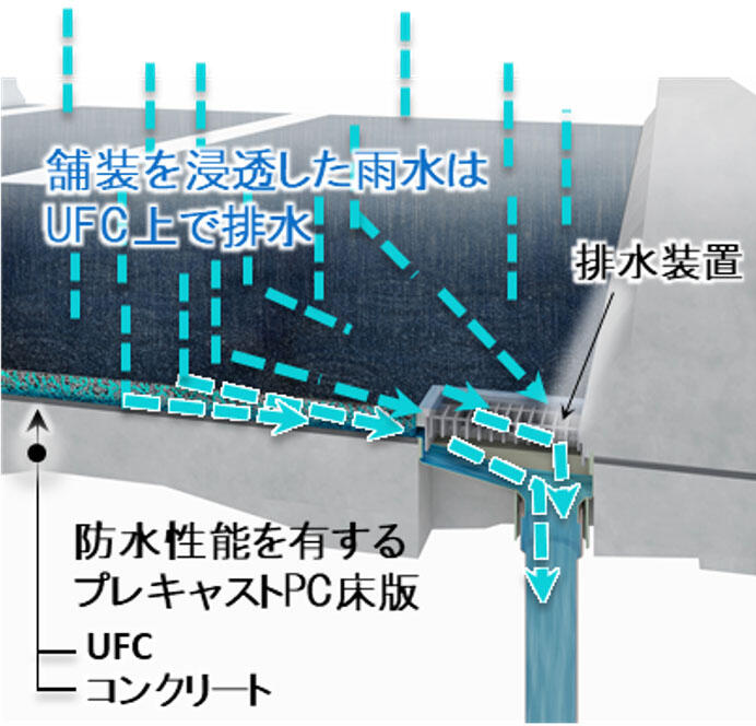 プレキャストPC床版の厚さは220㎜で、そのうちUFCの厚さは、プレキャストコンクリートの製造および供用中の荷重作用などによってひび割れが生じない20~50㎜としている。UFCは下部のコンクリートが固まる前に打設して一体化させるため接着剤などは使わない。UFCはセルフレベリング性を有するため、勾配対応とりわけ地覆立ち上がり部の成型が難しいが、同社では、独自のノウハウを駆使して高欄との接続部30~50㎜高さの地覆立ち上がり部も一体成型した形でプレキャストPC床版を製作できる。舗装を浸透した雨水はUFC上で排水され、コンクリート内部への浸透を抑制する。