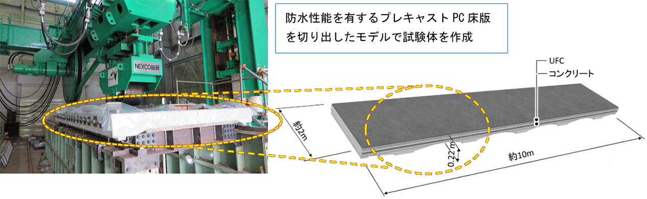 開発にあたっては、実物大の床版切り出しモデル輪荷重走行試験を行い、①従来のプレキャストPC床版と同等以上の疲労耐久性を有すること、②プレキャスト床版の普通部のコンクリートとUFCとの一体性が確保されていること、③防水性能が保持されていること、を確認した。検証では、大林組が開発したUFC「スリムクリート」を用いた。