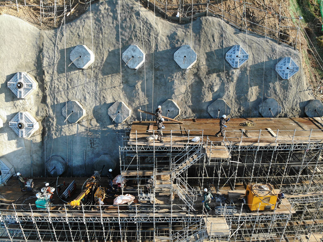 高さ80m、斜度が90度近いのり面に作業構台を1カ月で組立